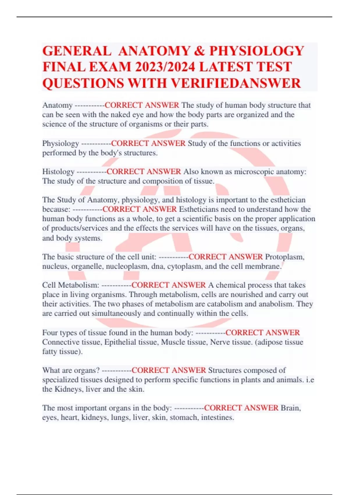 GENERAL ANATOMY & PHYSIOLOGY FINAL EXAM 2023/2024 LATEST TEST QUESTIONS WITH VERIFIEDANSWER