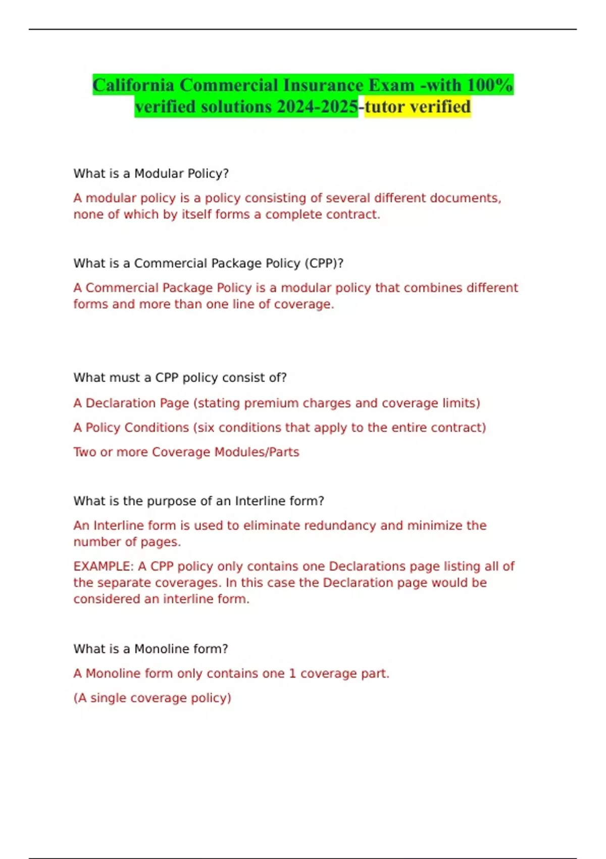 California Commercial Insurance Exam -with 100% verified solutions -tutor verified