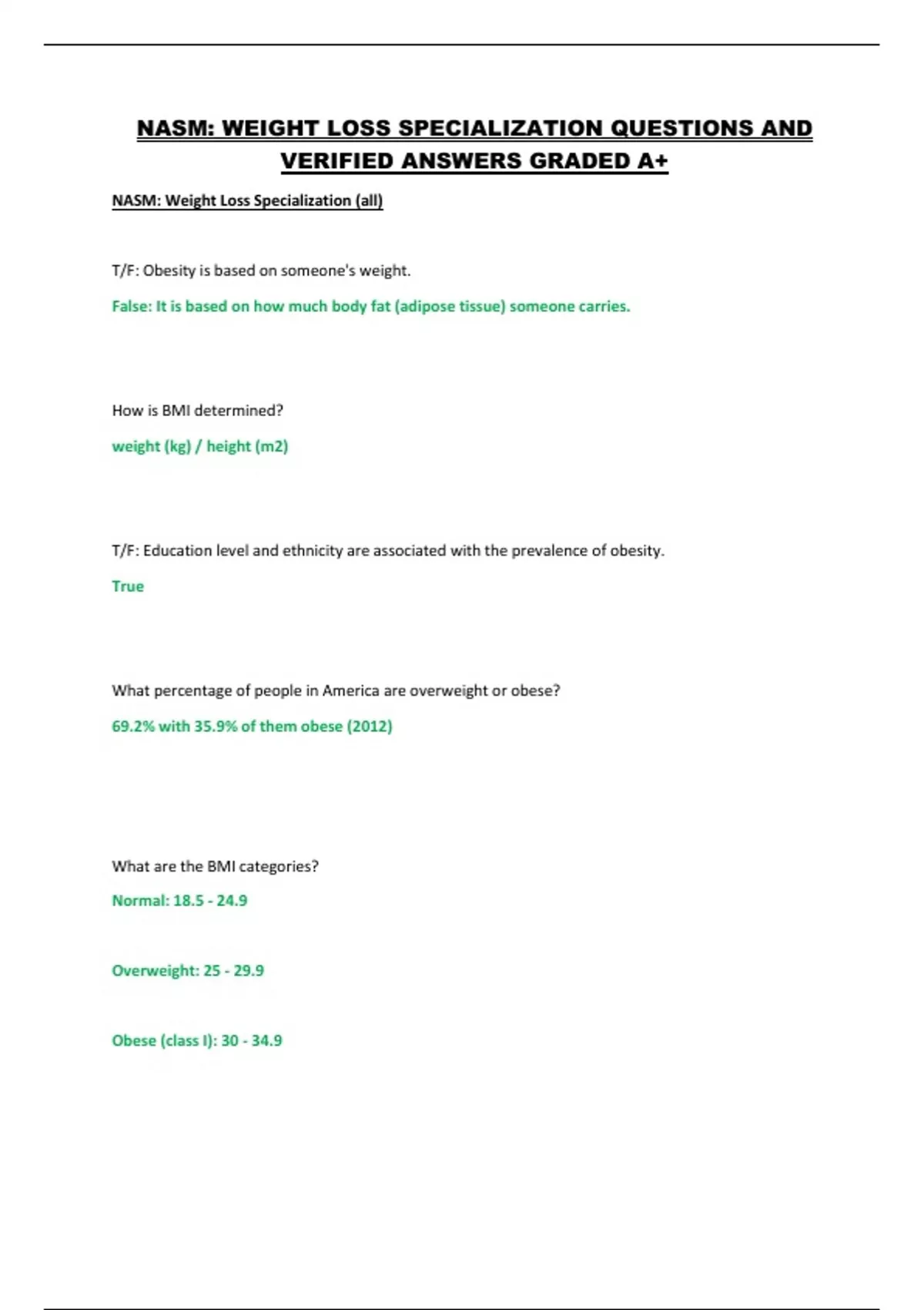 NASM: WEIGHT LOSS SPECIALIZATION QUESTIONS AND VERIFIED ANSWERS GRADED A+