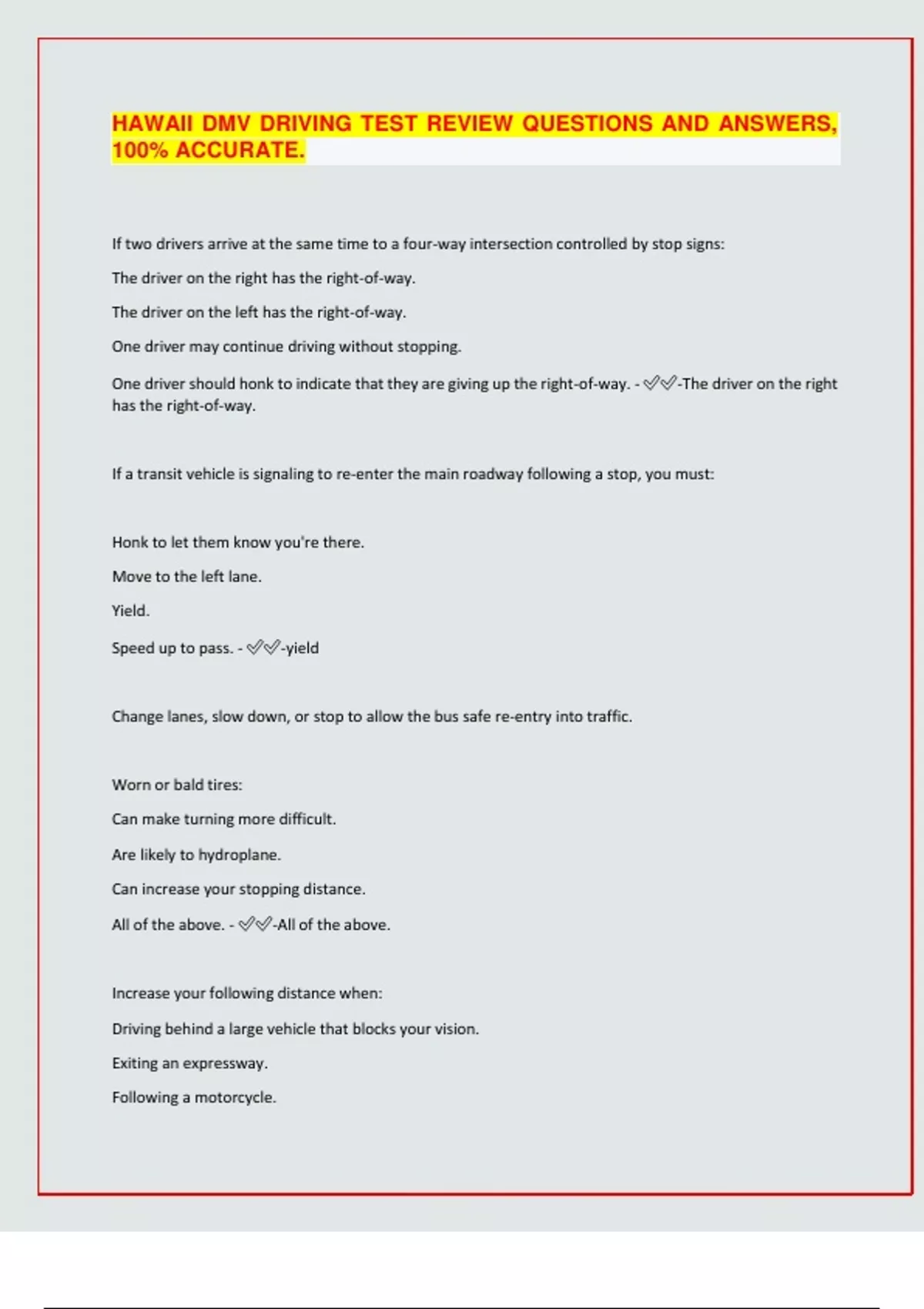 HAWAII DMV DRIVING TEST REVIEW QUESTIONS AND ANSWERS, 100% ACCURATE. If two drivers arrive at the same time to a four-way intersection controlled by stop signs: The driver on the right has the right-of-way. The driver on the left has the right-of-way. One driver may continue driving without stopping. One driver should honk to indicate that they are giving up the right-of-way. - -The driver on the right has the right-of-way. If a transit vehicle is signaling to re-enter the main roadway following a stop, you must: Honk to let them know you're there. Move to the left lane. Yield. Speed up to pass. - -yield Change lanes, slow down, or stop to allow the bus safe re-entry into traffic. Worn or bald tires: Can make turning more difficult. Are likely to hydroplane. Can increase your stopping distance. All of the above. - -All of the above. Increase your following distance when: Driving behind a large vehicle that blocks your vision. Exiting an expressway. Following a motorcycle. All of the above. - -All of the abov