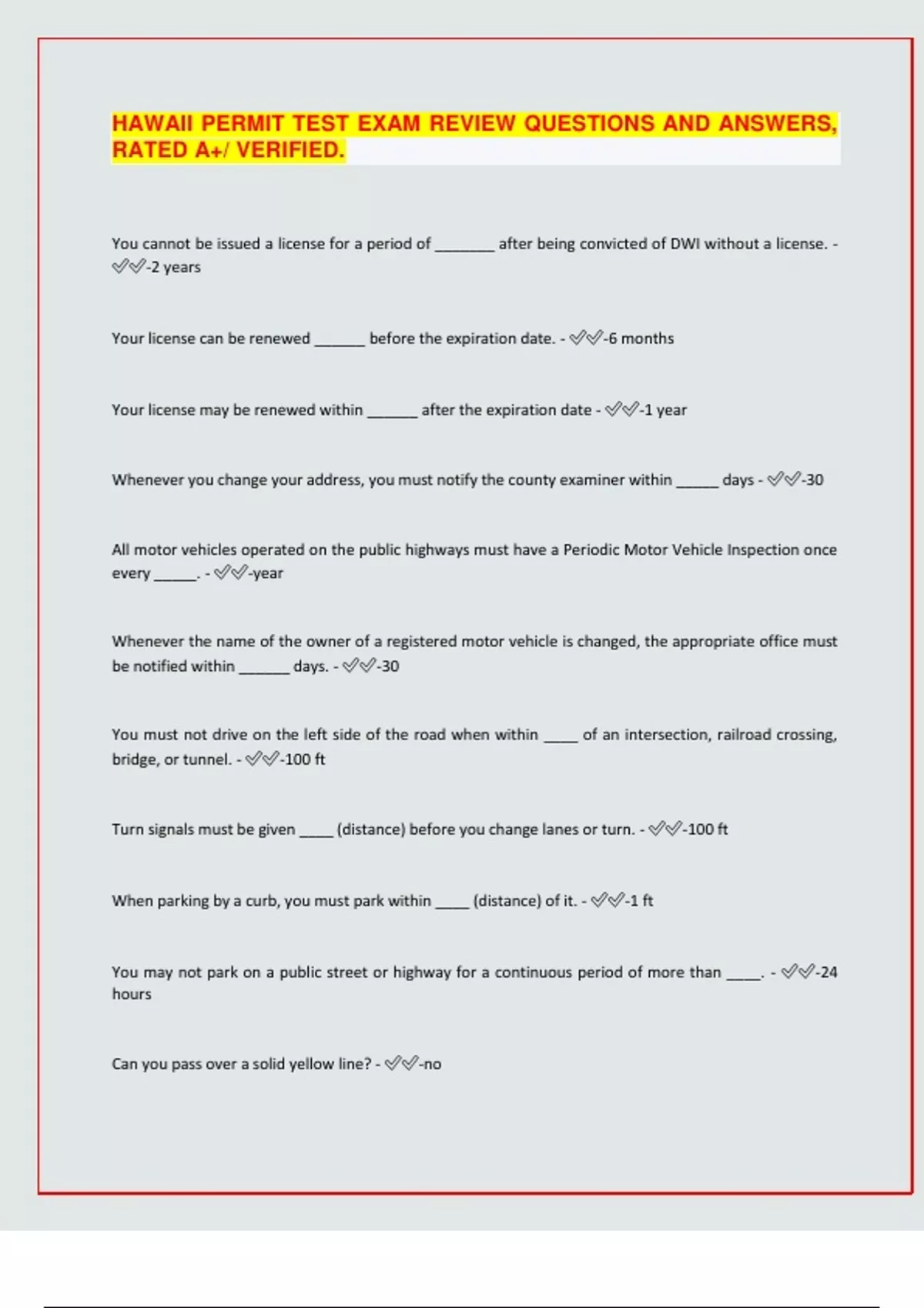 HAWAII PERMIT TEST EXAM REVIEW QUESTIONS AND ANSWERS, RATED A+/ VERIFIED. You cannot be issued a license for a period of _______ after being convicted of DWI without a license. - -2 years Your license can be renewed ______ before the expiration date. - -6 months Your license may be renewed within ______ after the expiration date - -1 year Whenever you change your address, you must notify the county examiner within _____ days - -30 All motor vehicles operated on the public highways must have a Periodic Motor Vehicle Inspection once every _____. - -year Whenever the name of the owner of a registered motor vehicle is changed, the appropriate office must be notified within ______ days. - -30 You must not drive on the left side of the road when within ____ of an intersection, railroad crossing, bridge, or tunnel. - -100 ft Turn signals must be given ____ (distance) before you change lanes or turn. - -100 ft When parking by a curb, you must park within ____ (distance) of it. - -1 ft You may not park on a public street or highway for a continuous period of more than ____. - -24 hours Can you pass over a solid yellow line? - -no Can you pass over a broken yellow line? - -with caution Can you pass over a double solid yellow line? - -only to make a left turn Can you pass a double solid white line? - -no After stopping at a red light, you may turn _____ when it is clear and there are no signs prohibiting it. - -right If you have a green light, is it necessary to yield to cars already in the intersection? - -yes Do lighted arrows have the same meaning as standard traffic lights for the indicated lane of traffic? - - yes Which kind of light has the same meaning as a stop sign? - -red flashing When involved in an accident should you move the injured to a safer area? - -no Upon striking an unattended vehicle, what information should you leave on the vehicle? - -name and address Which two offices must you contact after being in
