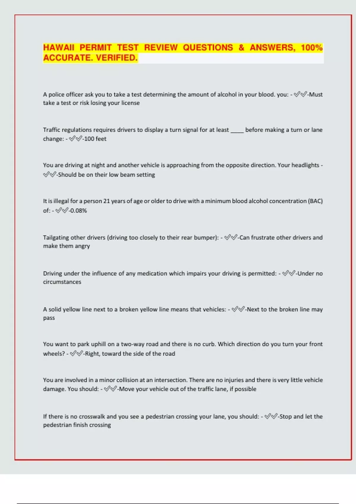 HAWAII PERMIT TEST REVIEW QUESTIONS & ANSWERS, 100% ACCURATE. VERIFIED. A police officer ask you to take a test determining the amount of alcohol in your blood. you: - -Must take a test or risk losing your license Traffic regulations requires drivers to display a turn signal for at least ____ before making a turn or lane change: - -100 feet You are driving at night and another vehicle is approaching from the opposite direction. Your headlights - -Should be on their low beam setting It is illegal for a person 21 years of age or older to drive with a minimum blood alcohol concentration (BAC) of: - -0.08% Tailgating other drivers (driving too closely to their rear bumper): - -Can frustrate other drivers and make them angry Driving under the influence of any medication which impairs your driving is permitted: - -Under no circumstances A solid yellow line next to a broken yellow line means that vehicles: - -Next to the broken line may pass You want to park uphill on a two-way road and there is no curb. Which direction do you turn your front wheels? - -Right, toward the side of the road You are involved in a minor collision at an intersection. There are no injuries and there is very little vehicle damage. You should: - -Move your vehicle out of the traffic lane, if possible If there is no crosswalk and you see a pedestrian crossing your lane, you should: - -Stop and let the pedestrian finish crossing You are driving on the freeway behind a large truck. You should drive: - -Farther behind the truck than you would if following a passenger vehicle. You must yield to a pedestrian using a white cane or guide dog: - -At all times To see vehicles in your blind spots, you should check: - -Over your shoulders You are on the freeway and traffic is merging into your lane. You should: - -Make room for the merging traffic, if possible Extra space in front of a large truck is needed for: - -The truck driver to stop the vehicle. When passing another vehicle, it is safe to return to your lane if you: - -See the vehicle's headlights in your rearview mirror. If you see orange construction signs and cones on a freeway, you must: - -Be prepared for workers and equipment ahead. When driving at night on a dimly lit street, you should: - -Drive slowly enough so you can stop within the area lighted by your headlights When you are merging onto the freeway, you should be driving: - -At or near the same speed as the traffic on the freeway If you plan to pass another vehicle, you should: - -Not assume the other driver will make space for you to return to your lane A large truck is ahead of you and is turning right onto a street with two
