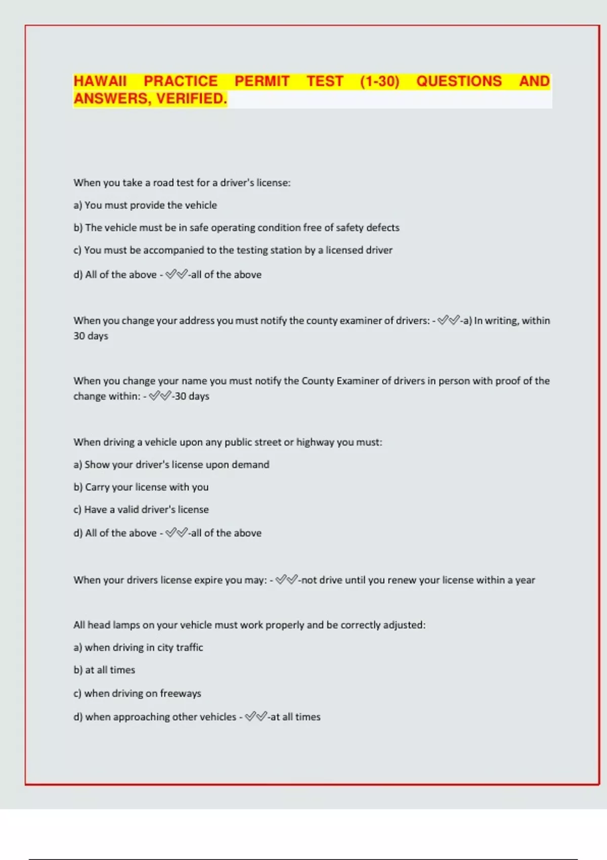 HAWAII PRACTICE PERMIT TEST (1-30) QUESTIONS AND ANSWERS, VERIFIED.| latest update 2024/25|