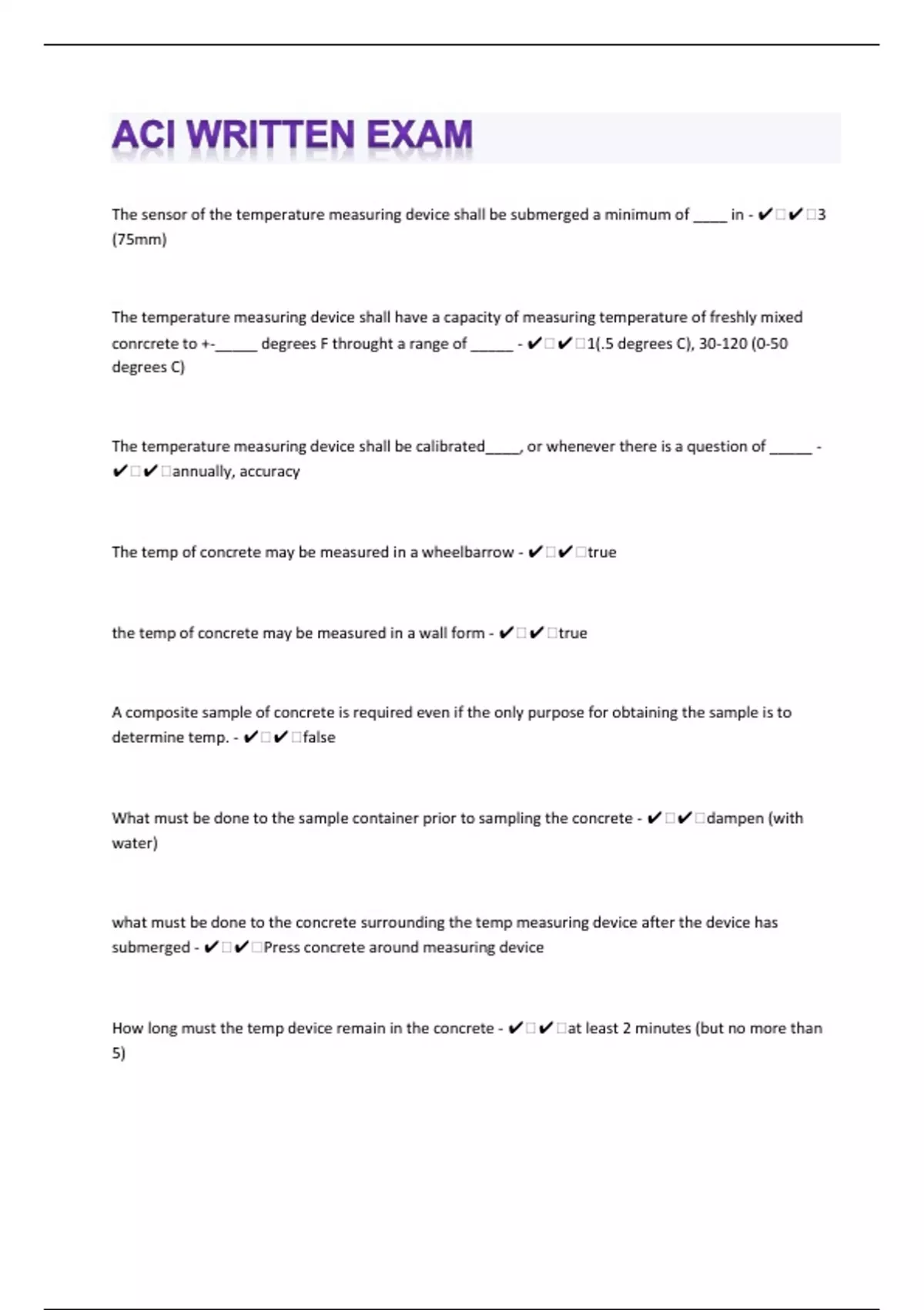 The sensor of the temperature measuring device shall be submerged a minimum of ____ in - ️️3 (75mm) The temperature measuring device shall have a capacity of measuring temperature of freshly mixed conrcrete to +-_____ degrees F throught a range of _____ - ️️1(.5 degrees C), 30-120 (0-50 degrees C) The temperature measuring device shall be calibrated____, or whenever there is a question of _____ - ️️annually, accuracy The temp of concrete may be measured in a wheelbarrow - ️️true the temp of concrete may be measured in a wall form - ️️true A composite sample of concrete is required even if the only purpose for obtaining the sample is to determine temp. - ️️false What must be done to the sample container prior to sampling the concrete - ️️dampen (with water) what must be done to the concrete surrounding the temp measuring device after the device has submerged - ️️Press concrete around measuring device How long must the temp device remain in the concrete - ️️at least 2 minutes (but no more than 5)