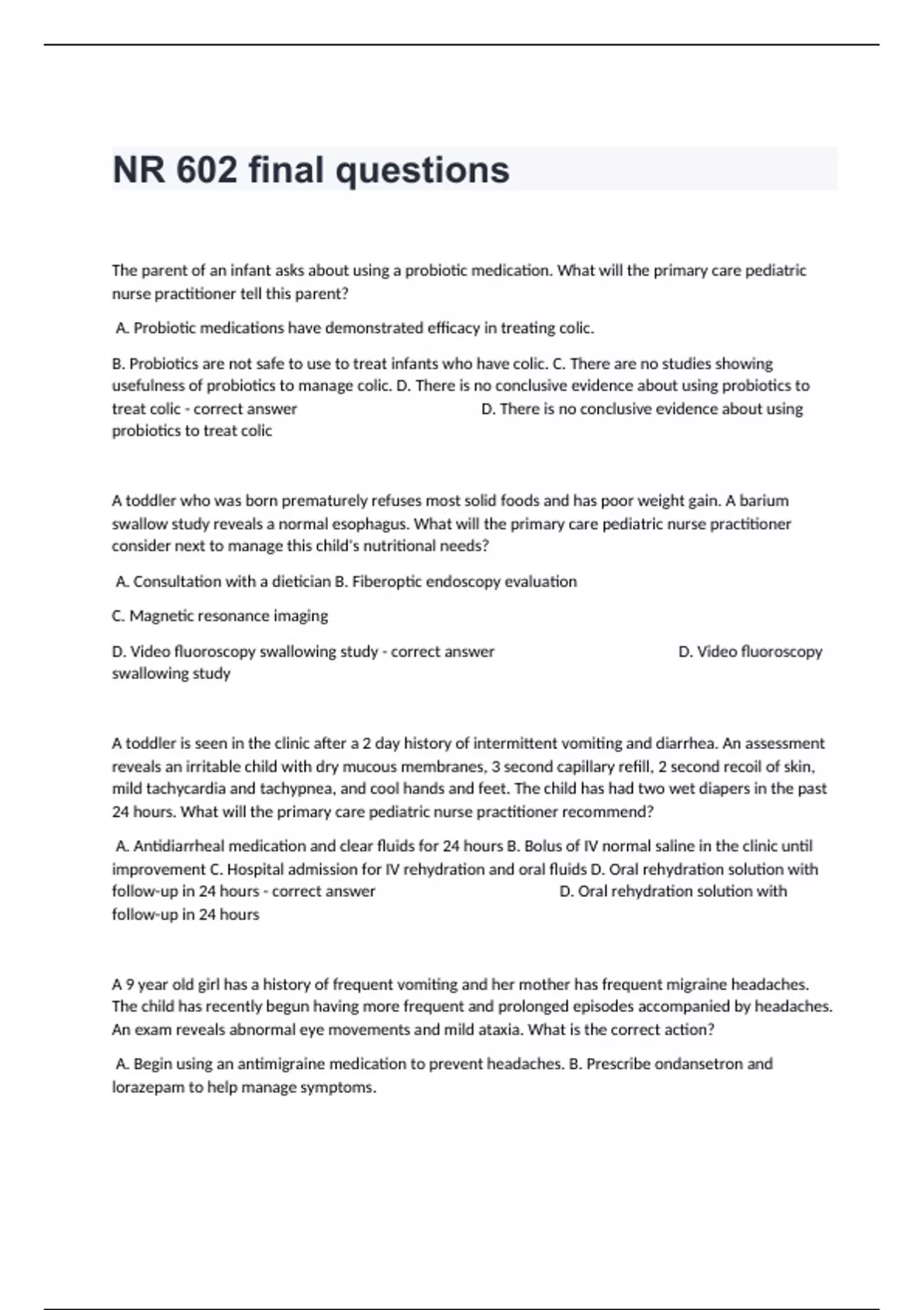 The parent of an infant asks about using a probiotic medication. What will the primary care pediatric nurse practitioner tell this parent? A. Probiotic medications have demonstrated efficacy in treating colic. B. Probiotics are not safe to use to treat infants who have colic. C. There are no studies showing usefulness of probiotics to manage colic. D. There is no conclusive evidence about using probiotics to treat colic - correct answer D. There is no conclusive evidence about using probiotics to treat colic A toddler who was born prematurely refuses most solid foods and has poor weight gain. A barium swallow study reveals a normal esophagus. What will the primary care pediatric nurse practitioner consider next to manage this child's nutritional needs? A. Consultation with a dietician B. Fiberoptic endoscopy evaluation C. Magnetic resonance imaging D. Video fluoroscopy swallowing study - correct answer D. Video fluoroscopy swallowing study A toddler is seen in the clinic after a 2 day history of intermittent vomiting and diarrhea. An assessment reveals an irritable child with dry mucous membranes, 3 second capillary refill, 2 second recoil of skin, mild tachycardia and tachypnea, and cool hands and feet. The child has had two wet diapers in the past 24 hours. What will the primary care pediatric nurse practitioner recommend? A. Antidiarrheal medication and clear fluids for 24 hours B. Bolus of IV normal saline in the clinic until improvement C. Hospital admission for IV rehydration and oral fluids D. Oral rehydration solution with follow-up in 24 hours - correct answer D. Oral rehydration solution with follow-up in 24 hours A 9 year old girl has a history of frequent vomiting and her mother has frequent migraine headaches. The child has recently begun having more frequent and prolonged episodes accompanied by headaches. An exam reveals abnormal eye movements and mild ataxia. What is the correct action? A. Begin using an antimigraine medication to prevent headaches. B. Prescribe ondansetron and lorazepam to help manage symptoms. C. Reassure the parent that this is expected with cyclic vomiting syndrome. D. Refer to a pediatric gastroenterologist for further workup - correct answer D. Refer to a pediatric gastroenterologist for further workup The parent of a 3 month old reports that the infant arches and gags while feeding and spits up undigested formula frequently. The infant's weight gain has dropped to the 5th percentile from the 12th percentile. What is the best course of treatment for this infant? A. Begin a trial of extensively hydrolyzed protein formula for 2 to 4 weeks. B. Institute an empiric trial of acid suppression with a proton pump inhibitor (PPI). C. Perform esophageal pH monitoring to determine the degree of reflux. D. Reassure the parent that these symptoms will likely resolve by 12 to 24 months. - correct answer A. Begin a trial of extensively hydrolyzed protein formula for 2 to 4 weeks. A school age child has a 3 month history of dull, aching epigastric pain that worsens with eating and awakens the child from sleep. A complete blood count shows a hemoglobin of 8 mg/dL. What is the next step in management? A. Administration of H2RA or PPI medications B. Empiric therapy for H. pylori (HP) C. Ordering an upper GI series D. Referral for esophagogastroduodenoscopy (EGD) - correct answer D. Referral for esophagogastroduodenoscopy (EGD) A 2 month old infant cries up to 4 hours each day and, according to the parents, is inconsolable during crying episodes with fists and legs noted to be tense and stiff. The infant is breastfeeding frequently but is often fussy during feedings. The physical exam is normal and the infant is gaining weight normally. What will the primary care pediatric nurse practitioner recommend? A. A complete workup, including laboratory and radiologic tests B. Eliminating certain foods from the mother's diet C. Empiric treatment with a proton pump inhibitor medication D. Stopping breastfeeding and beginning a hydrolyzed formula - correct answer B. Eliminating certain foods from the mother's diet .A child is in the clinic after swallowing a metal bead. A radiograph of the GI tract shows a 6 mm cylindrical object in the child's stomach. The child is able to swallow without difficulty and is not experiencing pain. What is the correct course of treatment? A. Administer ipecac to induce vomiting. B. Have the parents watch for the object in the child's stool. C. Insert a nasogastric tube to flush out the object. D. Refer the child for endosco