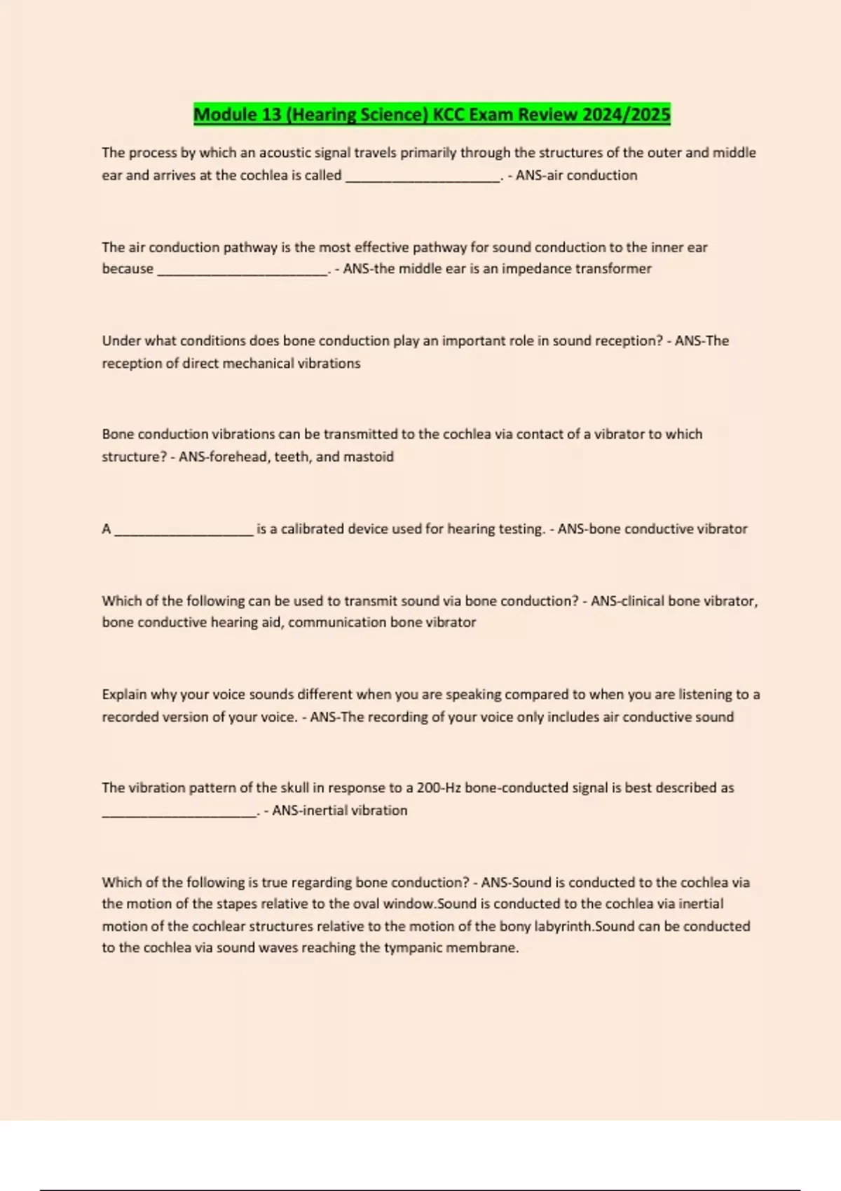 Module 13 (Hearing Science) KCC Exam Review 2024/2025 The process by which an acoustic signal travels primarily through the structures of the outer and middle ear and arrives at the cochlea is called ____________________. - ANS-air conduction The air conduction pathway is the most effective pathway for sound conduction to the inner ear because ______________________. - ANS-the middle ear is an impedance transformer Under what conditions does bone conduction play an important role in sound reception? - ANS-The reception of direct mechanical vibrations Bone conduction vibrations can be transmitted to the cochlea via contact of a vibrator to which structure? - ANS-forehead, teeth, and mastoid A __________________ is a calibrated device used for hearing testing. - ANS...