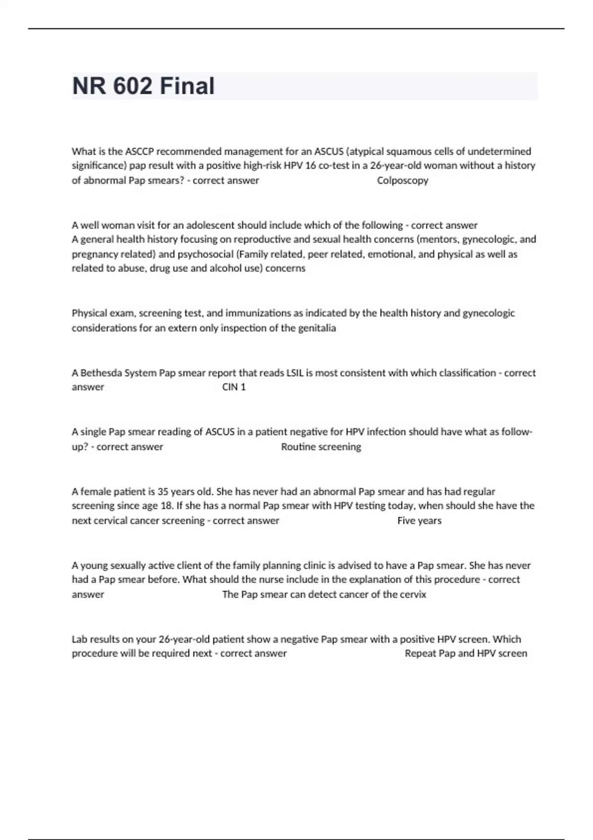 What is the ASCCP recommended management for an ASCUS (atypical squamous cells of undetermined significance) pap result with a positive high-risk HPV 16 co-test in a 26-year-old woman without a history of abnormal Pap smears? - correct answer Colposcopy A well woman visit for an adolescent should include which of the following - correct answer A general health history focusing on reproductive and sexual health concerns (mentors, gynecologic, and pregnancy related) and psychosocial (Family related, peer related, emotional, and physical as well as related to abuse, drug use and alcohol use) concerns Physical exam, screening test, and immunizations as indicated by the health history and gynecologic considerations for an extern only inspection of the genitalia A Bethesda System Pap smear report that reads LSIL is most consistent with which classification - correct answer CIN 1 A single Pap smear reading of ASCUS in a patient negative for HPV infection should have what as follow-up? - correct answer Routine screening A female patient is 35 years old. She has never had an abnormal Pap smear and has had regular screening since age 18. If she has a normal Pap smear with HPV testing today, when should she have the next cervical cancer screening - correct answer Five years A young sexually active client of the family planning clinic is advised to have a Pap smear. She has never had a Pap smear before. What should the nurse include in the explanation of this procedure - correct answer The Pap smear can detect cancer of the cervix Lab results on your 26-year-old patient show a negative Pap smear with a positive HPV screen. Which procedure will be required next - correct answer Repeat Pap and HPV screen Which of the following is not part of the criteria for an older woman to see if having any future Pap test performed - correct answer Over 55 years of age You are evaluating a 17-year-old Emily who presented with amenorrhea and normal secondary sex characteristics. The purpose of the progesterone challenge is to a certain the presence of - correct answer Endogenous estrogen A 17-year-old female patient presents with amenorrhea for four months she did experience menarche at age 15 but had not had a menstrual cycle since. On physical examination, it is noted that she has normal secondary sexual characteristics. The nurse practitioner will consider progesterone challenge to determine the presence of adequate - correct answer Endogenous estrogen A teenage patient presents with amenorrhea and moral secondary sex characteristics. The progesterone challenge is ordered. the purpose is to determine the presence of - correct answer Endogenous estrogen 18-year-old female complaining of secondary amenorrhea. On exam, there is a normal secondary sex characteristics and normal genitalia. Pregnancy is ruled out what would necessitate further evaluation - correct answer Galactorrhea Primary amenorrhea is best described as - correct answer Failure to menstrate by 13 years old A nurse practitioner is participating in a woman's health fair. When educating the woman about risk factors for breast cancer which of the following statements is incorrect? - correct answer Fibrocystic breast disease When educating women about breast cancer risk factors which statement is incorrect - correct answer Fibrocystic breast disease A woman with lobular carcinoma in situ has a relative risk of developing invasive breast cancer of - correct answer 8.0 Changes and hormonal regulation during menopause result in the gradual cessation of menstruation. From which gland is Androstenedione secreted - correct answer Adrenals A Pap smear results of atypical squamous cells of undetermined significance rule out high-grade squamous intraepithelial lesion will require which procedure - correct answer Colposcopy A Pap smear results of atypical squamous cells of undetermined significance require which procedure next - correct answer Follow-up Pap smear A 25-year-old presents with a report of a very tender area just near her introitus and to the left of her perineum. Very painful sex is how she knew something wasn't right. She showered and when washing, she felt a P sized painful lump on the left side of her bottom. She tells you she looked at it with the mirror and it was very small but now it is the size of a ping-pong ball and getting worse. when you Inspect her genitalia you are amazed at the size and appearance of the lump you know what appears to be an abscess on the left medial side of the labia minora and there is some edema extending into the perineum. Your diagnosis for this presentation is - correct answer Bartholins cyst You explain to this young woman what this "lump" is and let her know you will be referring her to a gynecologist you consult with regularly. You explain to her the likely treatment as follows: - correct answer A possible incision might be necessary and a catheter placed for 2 to 4 weeks to allow for drainage and appropriate healing A client at the woman's health clinic complains of swelling of the labia and throbbing pain in the labial area after sexual intercourse. For what condition does the nurse anticipate the client will be treated - correct answer Bartholinitis Which of the following choices represents a disorder of the reproductive tract that causes pain, erythema, dyspareunia, and a perineal mass - correct answer Bartholin cyst A nurse practitioner instructor is reviewing the anatomy of the external genitalia. At the opening of the vagina are the Bartolian glands. Which of the following describes the function of these glands - correct answer Production of alkaline secretions for sperm viability A 23-year-old woman presents to your practice with a chief complaint of postcoital bleeding. Which of the following would not be included in the initial assessment of this patient - correct answer Uterine biopsy A nurse practitioner is educating a woman who has a colposcopy. Which of the following most accurately describes a c