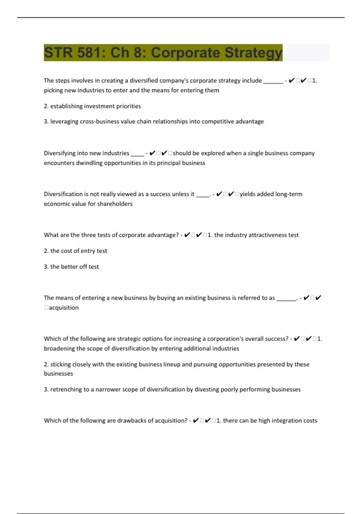 STR 581: Ch 8: Corporate Strategy 114 Questions with 100% Correct Answers | Updated & Verified|2024