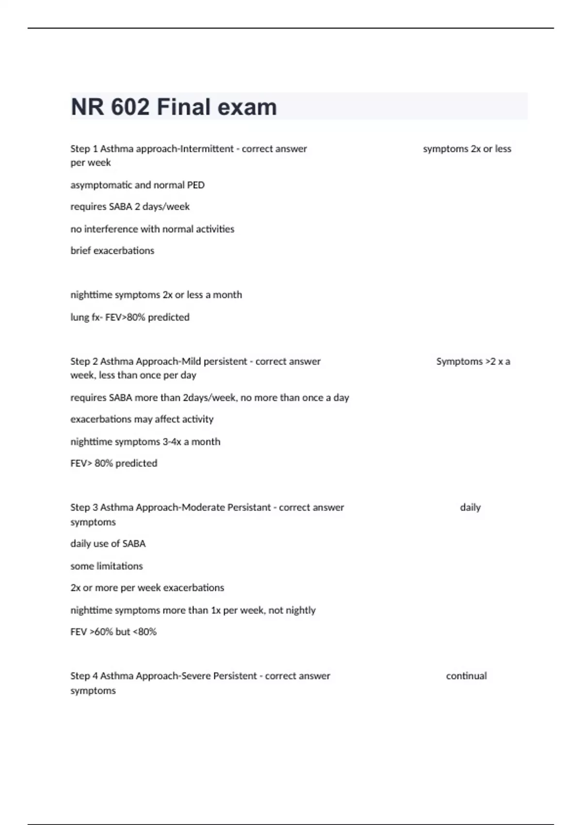 Step 1 Asthma approach-Intermittent - correct answer symptoms 2x or less per week asymptomatic and normal PED requires SABA 2 days/week no interference with normal activities brief exacerbations nighttime symptoms 2x or less a month lung fx- FEV>80% predicted Step 2 Asthma Approach-Mild persistent - correct answer Symptoms >2 x a week, less than once per day requires SABA more than 2days/week, no more than once a day exacerbations may affect activity nighttime symptoms 3-4x a month FEV> 80% predicted Step 3 Asthma Approach-Moderate Persistant - correct answer daily symptoms daily use of SABA some limitations 2x or more per week exacerbations nighttime symptoms more than 1x per week, not nightly FEV >60% but <80% Step 4 Asthma Approach-Severe Persistent - correct answer continual symptoms requires SABA multiple x a day extremely limited activity nighttime symptoms 7x a week FEV <60% Tx of asthma - correct answer Stepwise approach step 1: SABA PRN step 2: low dose ICS Step 3: low dose ICS+ LABA or medium dose ICS step 4: Medium dose ICS+LABA Step 5: high dose ICS+ LABA Step 6: High dose ICS+LABA + corticosteroid Step 6 Asthma Approach - correct answer Bulbar/palpebral conjunctival infection - correct answer May be unilateral or bilateral Leukocoria - correct answer abnormal appearance of a white film in the pupil; immediate referral to pediatric ophthalmologist warranted Causes: retinal detachment, cataract, retinal dysplasia, newborn retinoblastoma Visual screening in children - correct answer At least once between ages 3-5 y/o according to USPSTF AOM - correct answer RF: genetics, males, Native American, siblings, low economic status, ages 6mo-3y, winter, supine bottle feeding, daycare, tobacco smoke S/S of AOM - correct answer erythema, otalgia, bulging TM, absent cone of light Dx of AOM - correct answer Audiometry, tympanometry, possible lateral neck xray to r/o mass TX of AOM - correct answer uncomplicated: supportive with tylenol/ibuprofen; watchful waiting 48-72 in 6m-2y/o; <5 benzocaine otic drops 1st line antx: amoxicillin 80-90mg/kg/day Q12 x 10days if allergy to PCN- augmentin, cefuroxime Bacterial rhinosinusitis - correct answer Preceded by URI-typically worsens after 5-7 days- not resolved in 2 weeks Sx of bacterial rhinosinusitis - correct answer Purulant nasal congestion, drainage, facial pain, headache, fever No imaging required- if no improvement refer to ENT Bronchiolitis - correct answer Usually caused by RSV wheezing present <2 y/o other causes; influenza, adenovirus, rhinovirus S/s of bronchiolitis - correct answer Increased work of breathing, prolonged expiration, grunting, retractions, nasal flaring Croup sx - correct answer Low grade fever, URI symptoms, barking cough, inspiratory stridor can occur Croup dx - correct answer Made from symptoms Croup tx - correct answer Glucocorticoids possibly 0.6mg/kg-1mg/kg humidified air bronchodilators Lead poisoning - correct answer Inactivated heme synthesis by inhibiting insertion of iron-leads to microcytic hy