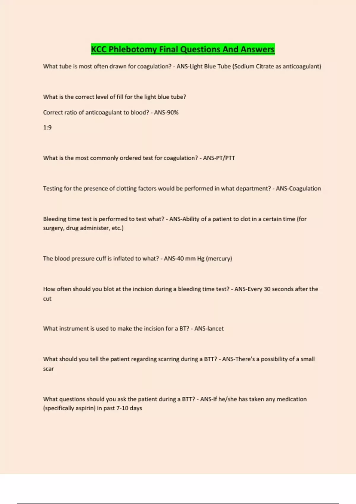 KCC Phlebotomy Final Questions And Answers What tube is most often drawn for coagulation? - ANS-Light Blue Tube (Sodium Citrate as anticoagulant) What is the correct level of fill for the light blue tube? Correct ratio of anticoagulant to blood? - ANS-90% 1:9 What is the most commonly ordered test for coagulation? - ANS-PT/PTT Testing for the presence of clotting factors would be performed in what department? - ANS-Coagulation Bleeding time test is performed to test what? - ANS-Ability of a patient to clot in a certain time (for surgery, drug administer, etc.) The blood pressure cuff is inflated to what? - ANS-40 mm Hg (mercury) How often should you blot at the incision during a bleeding time test? - ANS-Every 30 seconds after the cut What instrument is used to make the incision for a BT? - ANS-lancet What should you tell the patient regarding scarring during a BTT? - ANS-There's a possibility of a small scar What questions should you ask the patient during a BTT? - ANS-If he/she has taken any medication (specifically aspirin) in past 7-10 days **We will have their patient record and know of any drugs/medical history already. What 4 components are in the electrolyte panel? - ANS-Na, K, Cl, CO2 What test is most altered if the patient makes a fist or pumps his/her fist? - ANS-CK and slightly pottasium as well A CK test is for which organ? - ANS-Tests the Heart~ Creatine kinase (CK) tests for muscle damage, particularly myocardial infarction (heart attack) What does lipemia mean and what would the specimen look like? - ANS-Lipemia - think "lipids" or fats is high presence of fat in the blood, due to a fatty diet; looks turbid/cloudy What tests would be most effected by a lipemic specimen? - ANS-Glucose, cholesterol, triglycerides, lipid profiles What organ is being analyzed for a BUN, creatinine test? - ANS-Kidneysblood urea nitrogen (BUN) test measures the amount of nitrogen in your blood that comes from the waste product urea that is made in the liver and passed out of your body in the urine. A BUN test is done to see how well your kidneys are working Creatinine is transported through the bloodstream to the kidneys. The kidneys filter out most of the creatinine and dispose of it in the urine What organ is being analyzed for a biliruben test? - ANS...