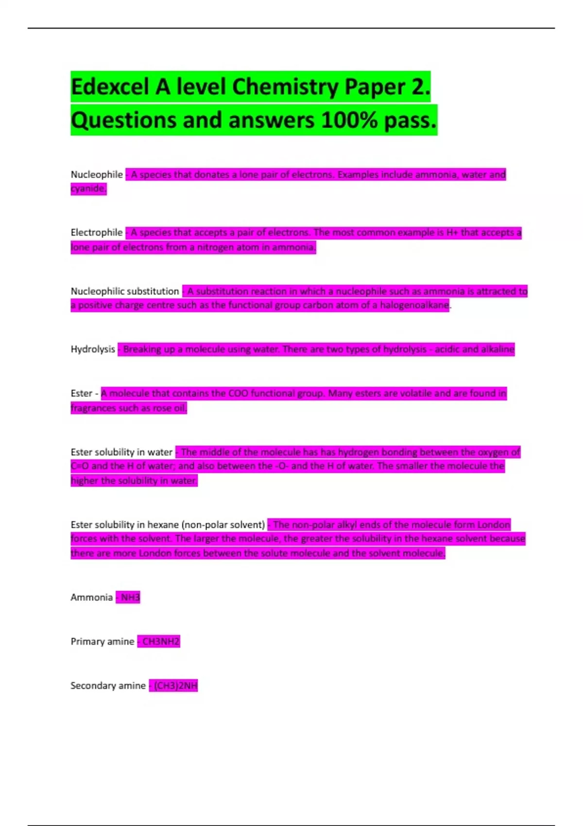 Edexcel A level Chemistry Paper 2. Questions and answers 100% pass.