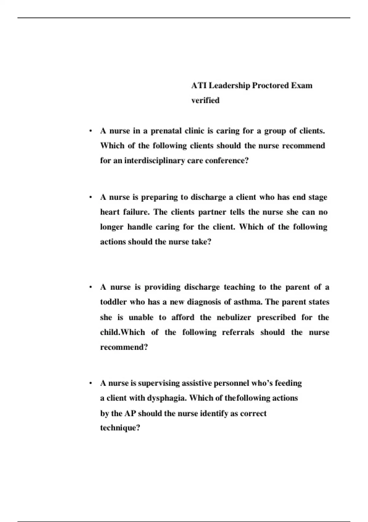 ATI Leadership Proctored Exam verified • A nurse in a prenatal clinic is caring for a group of clients. Which of the following clients should the nurse recommend for an interdisciplinary care conference? • A nurse is preparing to discharge a client who has end stage heart failure. The clients partner tells the nurse she can no longer handle caring for the client. Which of the following actions should the nurse take? • A nurse is providing discharge teaching to the parent of a toddler who has a new diagnosis of asthma. The parent states she is unable to afford the nebulizer prescribed for the child.Which of the following referrals should the nurse recommend? • A nurse is supervising assistive personnel who’s feeding a client with dysphagia. Which of thefollowing actions by the AP should the nurse identify as correct technique? • A nurse is providing an in-service about client rights for a group of nurses. Which of the followingstatements should the nurse include in the in-service? • A nurse is preparing to discharge a client who requires home oxygen. The equipment company hasnot yet delivered the oxygen tank. Which of the following action should the nurse take? • A nurse is preparing a client for surgery. The client has signed the consent form but tells the nurse that she has reconsidered because she is worried about the pain. Which of the following response bythe nurse is appropriate? • A nurse in a long-term care facility is caring for a client and witnessed the assistive personnel position him in bed with excessive force. Which of the following actions should the nurse take? • A nurse is assessing a client who has meningitis. Which of the following finding should the nurse report to the provider immediately? • A nurse is caring for a client who wanders through the halls yelling obscenities at staff other clients and visitors. Which action should the nurse take? • Administer sedatives • Keep the client in her room with the door closed C) D) Place the client in a wheelchair with a lap tray