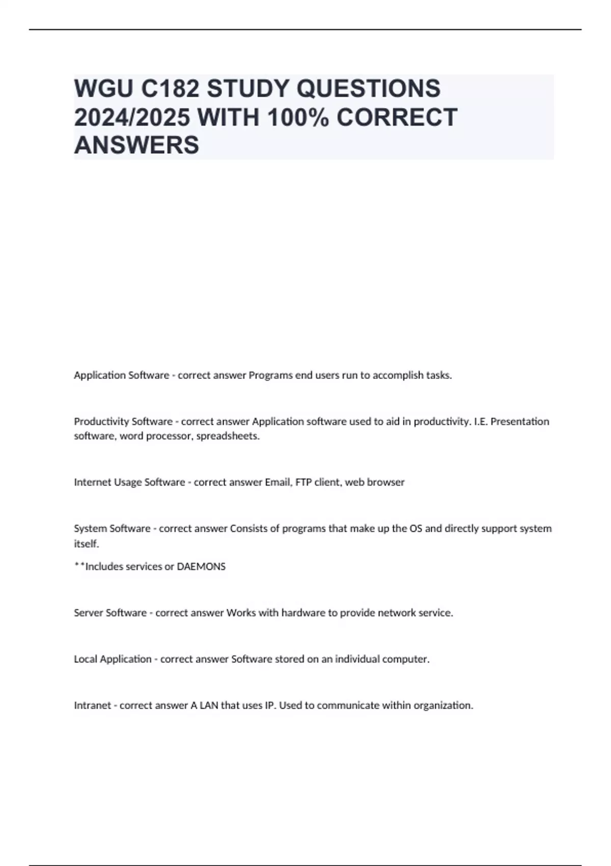 Application Software - correct answer Programs end users run to accomplish tasks. Productivity Software - correct answer Application software used to aid in productivity. I.E. Presentation software, word processor, spreadsheets. Internet Usage Software - correct answer Email, FTP client, web browser System Software - correct answer Consists of programs that make up the OS and directly support system itself. **Includes services or DAEMONS Server Software - correct answer Works with hardware to provide network service. Local Application - correct answer Software stored on an individual computer. Intranet - correct answer A LAN that uses IP. Used to communicate within organization. Cloud Computing - correct answer Allows organization to access resources/app anywhere, anytime. Beneficial because an org. may access resources it may not normally have. Operating Systems - correct answer Allows a user to easily access hardware/software, required to maintain computer environment. Kernel - correct answer Core component of OS. Loads when computer first boots Sits on top of hardware, is interface b/w hardware and software. Device Drivers - correct answer Interface b/w OS and hardware. Shell - correct answer Interface for user, often personalized. The shell provides access to the kernel. I.E. The GUI will translate mouse motions into calls to kernel/routines. Desktop elements include shortcuts, windows theme, menus, background. Services (Daemons) - correct answer OS programs that start when OS is loaded. They run in the background and wait for an event to initiate. Utility Programs - correct answer Allow user to monitor system performance. Web Server - correct answer Role is to respond to HTTP requests. *Most HTTP requests are for HTML docs, but could include any web accessible resource. It's all combined into the URL. **APACHE is most popular web server-can execute scripts for dynamic pages, use security mechanisms, log request for trend tracking. Proxy Server - correct answer Acts as a giant cache and allows pages accessed frequently in an organization to be accessed locally. *Also provides degree of anonymity, since IP address recorded is for proxy server and not individual client. *Can also be used to block requests to certain servers (i.e Facebook) *Can reject responses that contain certain content (i.e "porn") **SQUID is most common, but APACHE can also be used as proxy server. Database Server - correct answer Permits dB access across a network. Performs tasks such as data analysis, data manipulation, security,and archiving. May/may not store database itself. **MySQL is popular. FTP Server - correct answer Hosts files and allows clients access to files. Access is in form of uploading/downloading files. Requires either user has an account or logs in as anonymous user. File Server - correct answer Computer with large hard disk storing files, but can also store software to be run over network. Email Server - correct answer Provides email service. Accepts email request from clients. IMAP,POPS,HTTP,MAPI,MIME String Data - correct answer Alphanumeric or text Ex: James (Last name) 623 Hill Street Number Integer - correct answer Numeric data, whole numbers. Ex: 4 Floating Point - correct answer Decimal. Ex: 4.2 Date/Time - correct answer Type of Data Boolean/Logical - correct answer Type of Data. Ex: True/False (in reply to active subscriber?) Only two possible answers: yes/no or true/false Flat File Database - correct answer One large single table without relations between tables. *Most common is CSV file (files separated by comma) *Flat file is used if amount of data is fairly small. Ex: Spreadsheet Relational Database - correct answer Most common structure for database. *Distinguished by multiple tables with interrelated fields. *When queried, data can be pulled form any # of relations that may be contained in multiple databases. *Provides lots of flexibility. Hierarchical Database - correct answer Organizes data by using tree-like or organizational chart type structure. *Main data points can have multiple sub-data points (Parent/child structure)-Subpoints can only have one main data point. * Records can be broken up so one portion is in one location and another is in another section. Ex: Employee database could list all employees, but a child relation could contain info about employee