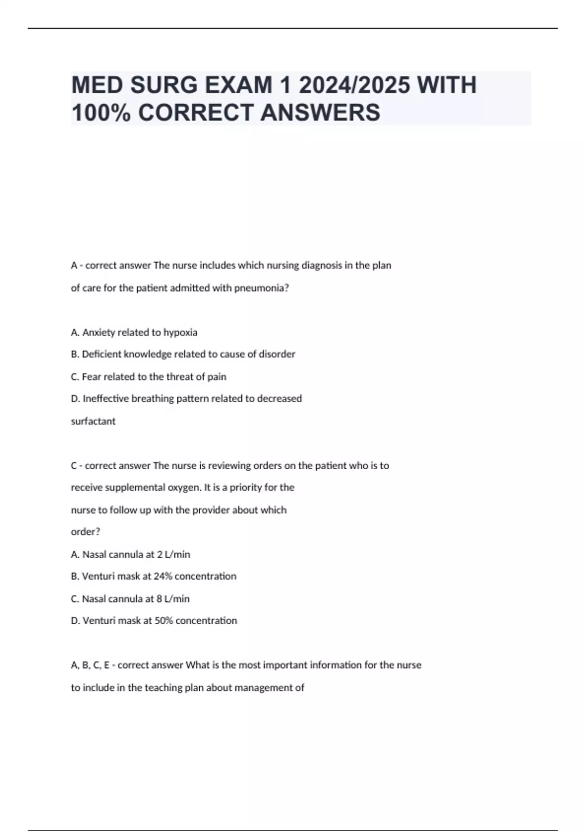 A - correct answer The nurse includes which nursing diagnosis in the plan of care for the patient admitted with pneumonia? A. Anxiety related to hypoxia B. Deficient knowledge related to cause of disorder C. Fear related to the threat of pain D. Ineffective breathing pattern related to decreased surfactant C - correct answer The nurse is reviewing orders on the patient who is to receive supplemental oxygen. It is a priority for the nurse to follow up with the provider about which order? A. Nasal cannula at 2 L/min B. Venturi mask at 24% concentration C. Nasal cannula at 8 L/min D. Venturi mask at 50% concentration A, B, C, E - correct answer What is the most important information for the nurse to include in the teaching plan about management of home oxygen therapy? (Select all that apply.) A. Do not change the settings of the oxygen without the health-care provider's permission. B. Place "No smoking" signs within the home. C. Oxygen is a fire hazard. D. Others may smoke around you as long as you do not smoke. E. Keep a fire extinguisher near the oxygen source A, D - correct answer The nurse is caring for a patient who is receiving oxygen therapy via the Venturi mask. Which complications are associated with oxygen therapy? (Select all that apply.) A. Oxygen toxicity B. Cachexia C. Bradycardia D. Absorption atelectasis E. Increased dead space A - correct answer The nurse is caring for a patient who has just been orally intubated. Which action should the nurse take first? A. Assess for symmetrical chest rise and fall with ventilation B. Provide mouth care to assure a clean oral cavity C. Assess the need for nutritional support by an oral nasogastric tube D. Provide a communication board for the patient and family D - correct answer When the nurse is performing postural drainage for the patient, which factor promotes the movement of secretions to the upper airways? A. Dilation of alveoli B. Action of the cilia C. Muscle contraction D. Force of gravity B - correct answer The nurse is screening patients for their risk of developing VAP. The nurse considers which patient at greatest risk? A. A patient who was extubated within 24 hours of being intubated B. A patient intubated and placed on mechanical ventilation less than 72 hours ago C. A patient with the head of the bed elevated 45 degrees D. A patient who was placed on a nasal cannula after being extubated B - correct answer A nursing preceptor is observing a newly hired nurse prioritizing patient rounds. Correct prioritization of assigned patients is indicated if the new nurse assesses which patient first? A. A patient with cellulitis of the right lower leg B. A patient who was extubated 2 hours ago C. A patient who was ordered nebulizer treatments prn D. A patient with an IV of D51 /2 NS at 125 mL/hr D - correct answer You are preparing a patient for surgery and have asked her to verify her information on her patient identification band. She tells you that the birth date is incorrect on her identification band. The most appropriate action by the nurse at this time is which of the following? A. Cross out the birth date and put the correct one in its place with the nurse's initials. B. Ask the family members to validate the patient's birth date. C. Call the surgeon's office to validate the birth date. D. Ask the admissions office to please send a corrected identification band. A, C, D - correct answer The nurse should report the following findings from a patient's history as an increased risk for DVTs postoperatively. (Select all that apply.) A. History of smoking B. Age C. History of DVTs with previous pregnancy D. Borderline hypertension E. Allergies C - correct answer Which of the following patients presents the greatest risk for a negative response to anesthesia? A. A 40-year-old male with high blood pressure B. A 20-year-old female with no prior surgical history C. A 29-year-old female with a history of stage II acute renal failure D. An 85-year-old male who drinks one glass of scotch every night A - correct answer During the initial assessment and admission questions, the nurse asks Maria for the time of her last oral intake. The patient replies, "I had dinner last night at 8 p.m., but I took a few sips of water this morning with my vitamins. The nurse's best response is which of the following? A. Explain to the patient that just a sip of water should not be a problem for anesthesia but that the vitamins may be a problem. We will pass that information on to the anesthesiologist. B. Tell the patient that the sip of water is not an issue because it was only a sip. C. Inform the patient that her surgery will not be performed today because the risk is too high for a negative outcome. D. Inform the patient that taking her vitamins before surgery was a good plan. B - correct answer Maria's surgeon has asked that thromboembolic stockings (TEDs) be placed on the patient before surgery as well as sequential compression devices on both legs to the knees. Maria asks the nurse what they will do for her. Which response by the nurse is most appropriate? A. "They work together to make sure that you do not have a decrease in arterial blood flow in your legs during the surgery." B. "They complement each other to prevent blood from backing up in your legs and causing a deep vein thrombosis due to you not moving during the surgery." C. "They prevent deep tissue clotting during the surgery." D. "The two devices do the same thing, but one is better during the surgery and the other is better postoperatively." A, B, C, D - correct answer When planning discharge education for a 65-year-old male who is having a hip replacement, it is appropriate for the nurse to consider which of the following? (Select all that apply.) A. The patient's resources at home for completing activities of daily living B. The number of stairs in the patient's home C. Transportation to follow-up appointments D. Preexisting medical conditions E. The number of bathrooms in the home D - c