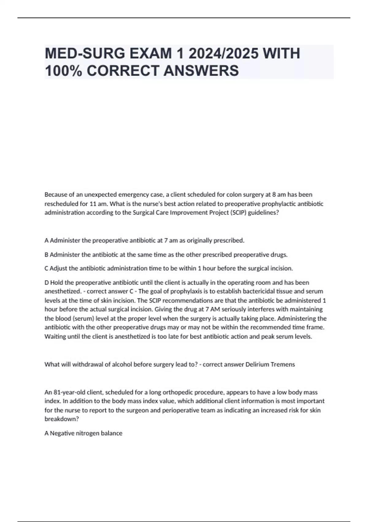 Because of an unexpected emergency case, a client scheduled for colon surgery at 8 am has been rescheduled for 11 am. What is the nurse's best action related to preoperative prophylactic antibiotic administration according to the Surgical Care Improvement Project (SCIP) guidelines? A Administer the preoperative antibiotic at 7 am as originally prescribed. B Administer the antibiotic at the same time as the other prescribed preoperative drugs. C Adjust the antibiotic administration time to be within 1 hour before the surgical incision. D Hold the preoperative antibiotic until the client is actually in the operating room and has been anesthetized. - correct answer C - The goal of prophylaxis is to establish bactericidal tissue and serum levels at the time of skin incision. The SCIP recommendations are that the antibiotic be administered 1 hour before the actual surgical incision. Giving the drug at 7 AM seriously interferes with maintaining the blood (serum) level at the proper level when the surgery is actually taking place. Administering the antibiotic with the other preoperative drugs may or may not be within the recommended time frame. Waiting until the client is anesthetized is too late for best antibiotic action and peak serum levels. What will withdrawal of alcohol before surgery lead to? - correct answer Delirium Tremens An 81-year-old client, scheduled for a long orthopedic procedure, appears to have a low body mass index. In addition to the body mass index value, which additional client information is most important for the nurse to report to the surgeon and perioperative team as indicating an increased risk for skin breakdown? A Negative nitrogen balance B Previous abdominal surgery C Allergy to latex products D Change in mental status upon admission - correct answer A - A negative nitrogen balance can be a sign of inadequate protein intake and malnutrition, resulting in a low BMI. These factors contribute to skin breakdown. Although the change in mental status can increase the risk for skin breakdown after surgery if the client is not aware of the need to change position, it is not the most critical risk factor at this time. The allergy to latex products is critical information to communicate to the perioperative team but does not contribute to skin breakdown. The preoperative admitting nurse notices that the client scheduled for total joint replacement surgery in 2 hours has a smell of alcohol on his breath even though he has just stated that he has fasted completely for the past 10 hours. What is the nurse's best first action? A Accept the client's statement and continue the preoperative preparation. B Report the discrepancy to the surgeon and anesthesiologist immediately. C Tell the client the observation and provide the opportunity for him to explain. D Remind the client that alcohol consumption may require changes in anesthesia procedure. - correct answer C - Although alcohol consumption before a surgical procedure with anesthesia can cause serious problems, the nurse should not "jump to conclusions" with his or her observations. Before informing the surgeon and anesthesiologist, the nurse should provide the client with the opportunity to explain the alcohol smell on his breath. Some mouthwashes contain chemicals and alcohol that could leave a perceptible odor. Also, the nurse could be mistaken about the odor. The patient states the surgeon discussed the addition of a second procedure to the one indicated on the consent. The patient is visibly upset that the consent he is asked to sign with the surgical resident reflects only one procedure and cannot understand why the nurse and resident do not have the authority to "fix" the consent. In addition, he states he will not take his wedding ring off because it has never left his hand since his wife put it there 30 years ago. 1. How would you address the patient's immediate concern regarding the consent? 2. Under what conditions could the second procedure be performed? 3. What remedy would you propose to prevent such occurrences in the future? 4. How will you respond to the patient's unwillingness to remove his wedding ring? - correct answer 1. How would you address the patient's immediate concern regarding the consent? Focus your answer on the safety aspect of the situation while acknowledging the patient's frustration. Inform the patient that you will contact the surgeon to clarify the consent in terms of accuracy and that neither you nor the surgical resident not have the authority to alter the consent without the surgeon's knowledge. Document it in the medical record. 2. Under what conditions could the second procedure be performed? The second procedure could be performed if a new consent is developed with both procedures listed and signed by the patient. This new consent can only be used if the patient is not under the influence of preoperative drugs that could cloud his judgment and if the patient has received adequate information regarding both procedures to be able to make an informed choice. 3. What remedy would you propose to prevent such occurrences in the future? Discuss the occurrence with the perioperative team, review existing policy, and make changes as needed. Propose a process for facilitating communication among departments and team members. 4. How will you respond to the patient's unwillingness to remove his wedding ring? Explain to him that removal of the ring is not necessary if the finger is not the operative site. Tape the ring in place if agency policy permits. If the agency does not permit this action, explain why and have his wife keep the ring with her until she sees him after surgery. Colostomy surgery is categorized as what type of surgery? Cosmetic Curative Diagnostic Palliative - correct answer Pallative - Palliative surgery is performed to relieve symptoms of a disease process, but does not cure the disease. Cosmetic surgery is performed primarily to alter or enhance personal appearance. Curative