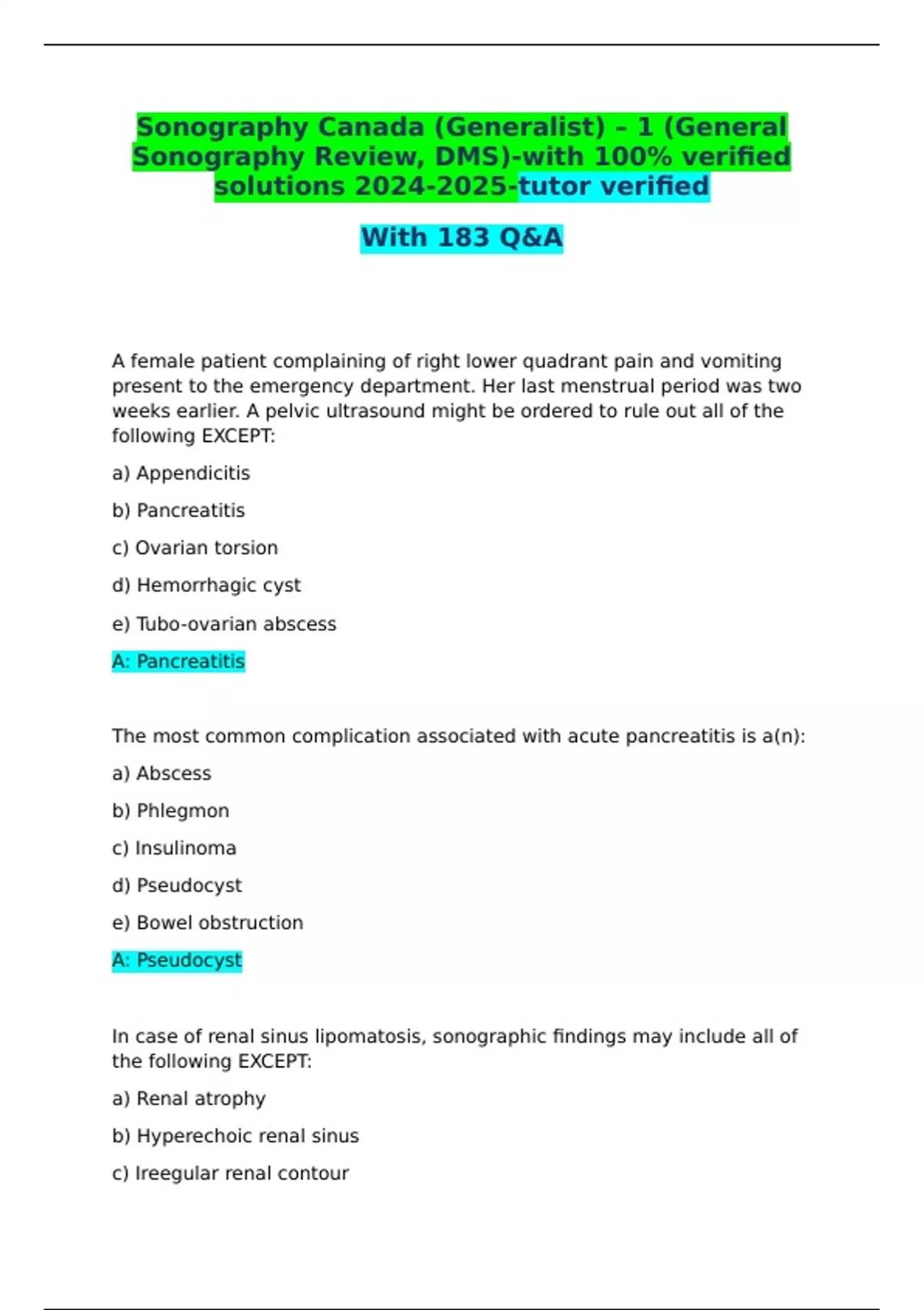 Sonography Canada (Generalist) – 1 (General Sonography Review, DMS)-with 100% verified solutions -tutor verified
