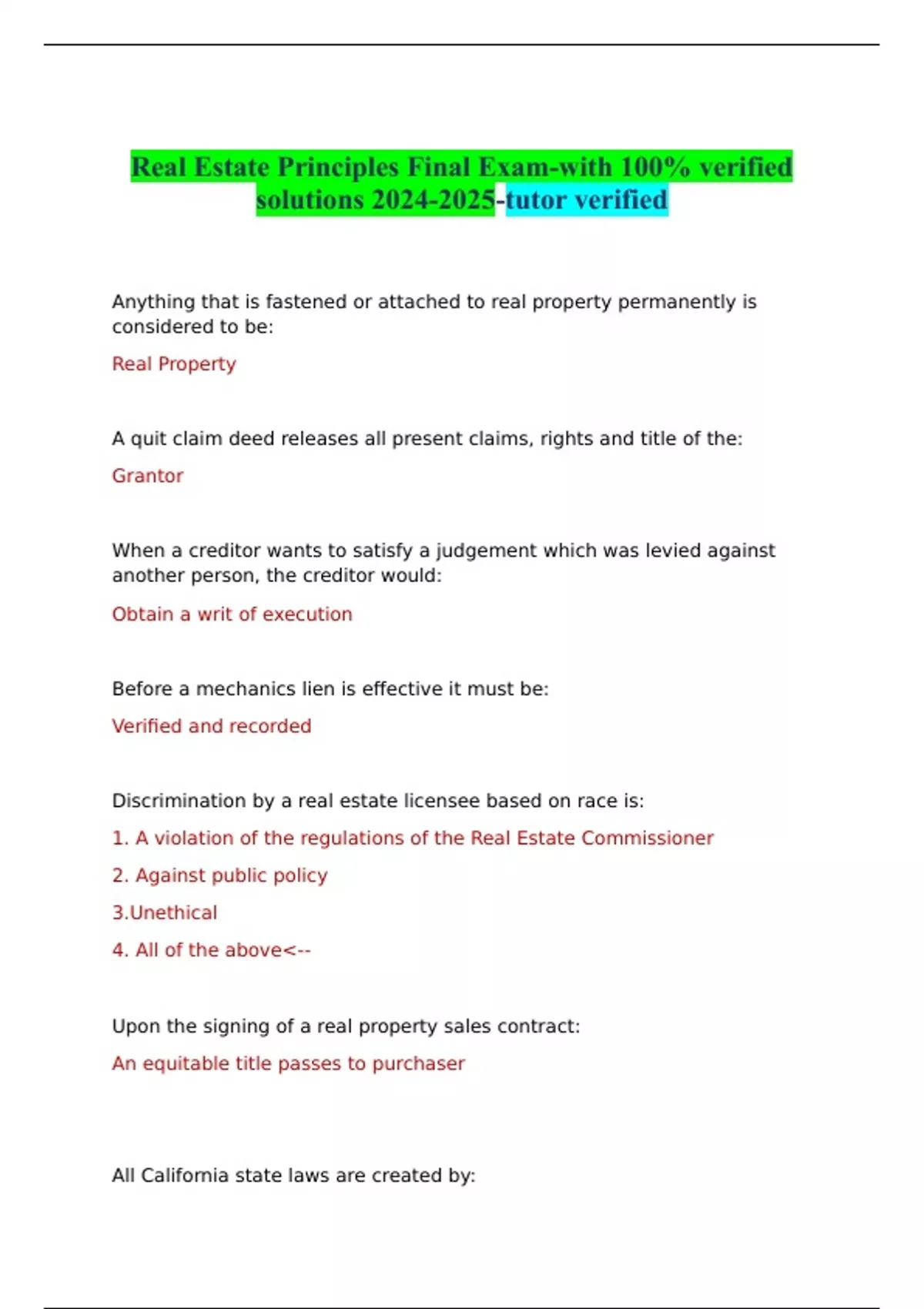 Real Estate Principles Final Exam-with 100% verified solutions -tutor verified