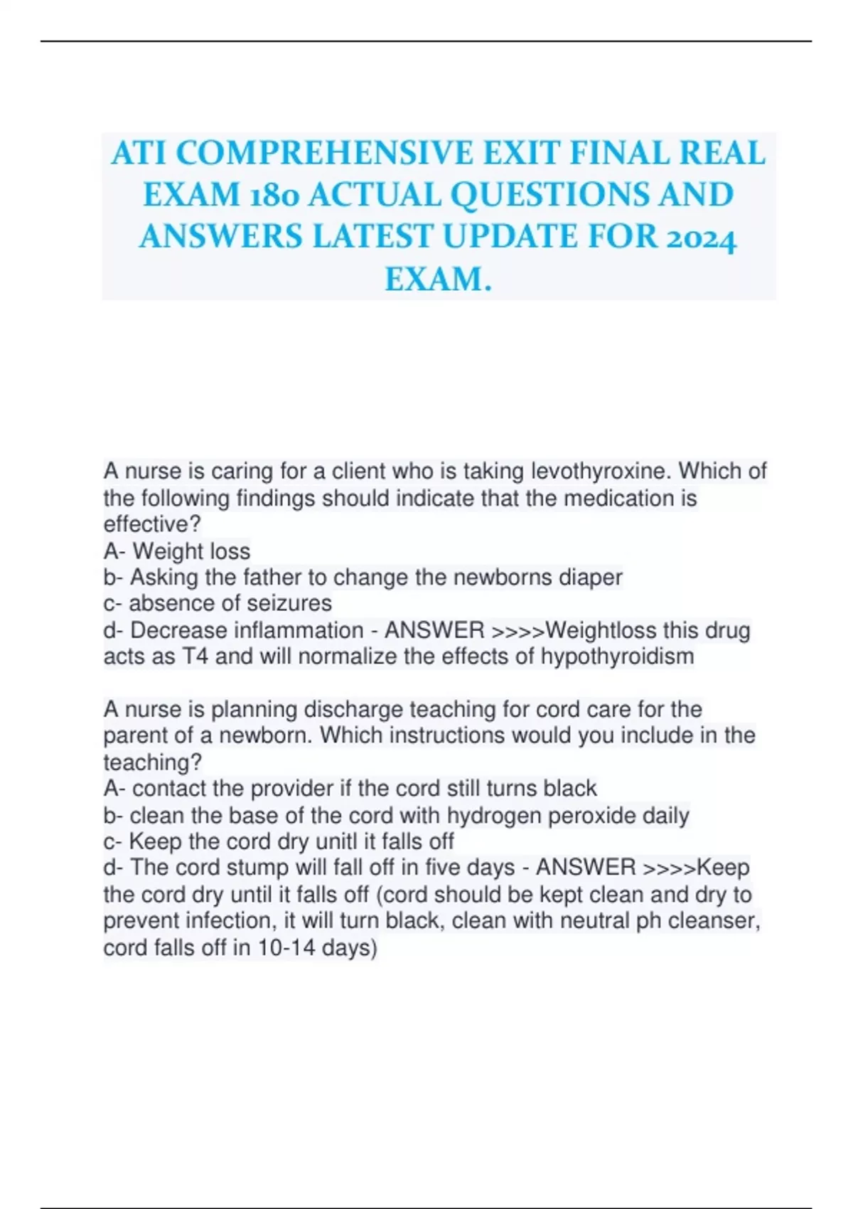 ATI COMPREHENSIVE EXIT FINAL REAL EXAM 180 ACTUAL QUESTIONS AND ANSWERS LATEST UPDATE FOR 2024 EXAM.