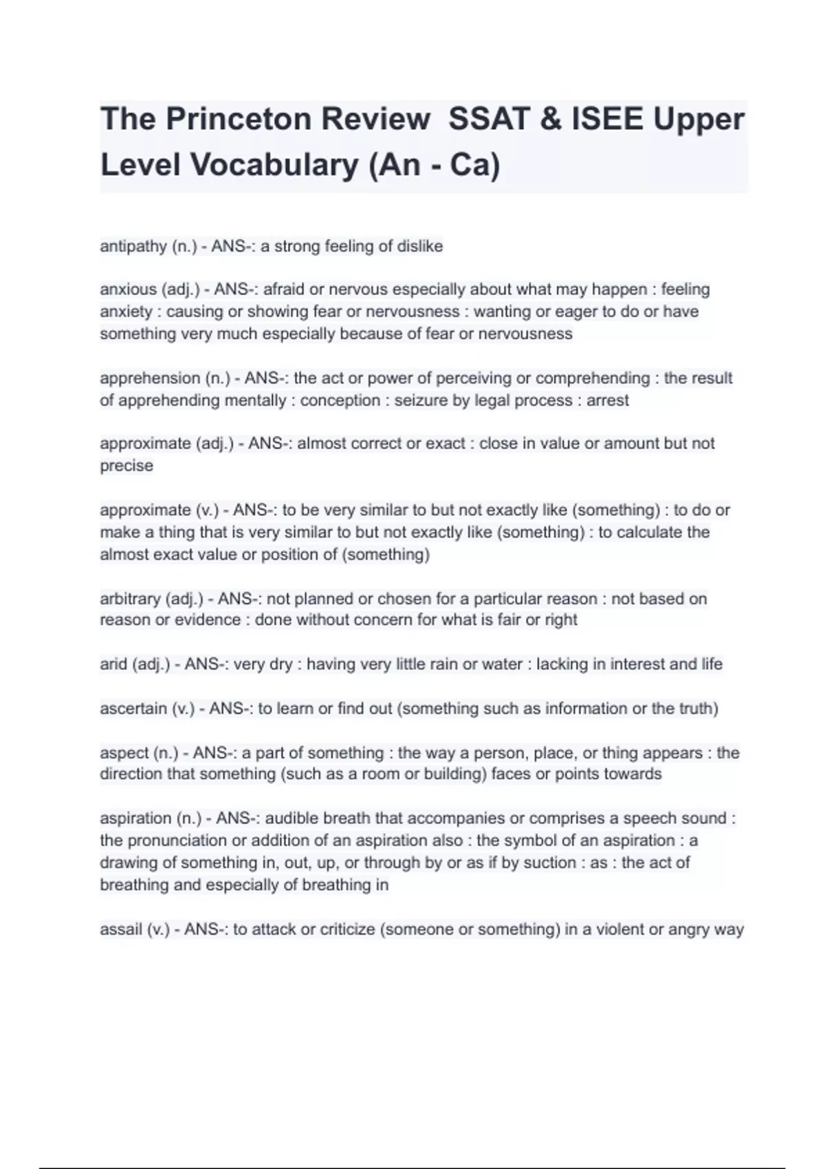 The Princeton Review SSAT & ISEE Upper Level Vocabulary (An - Ca).