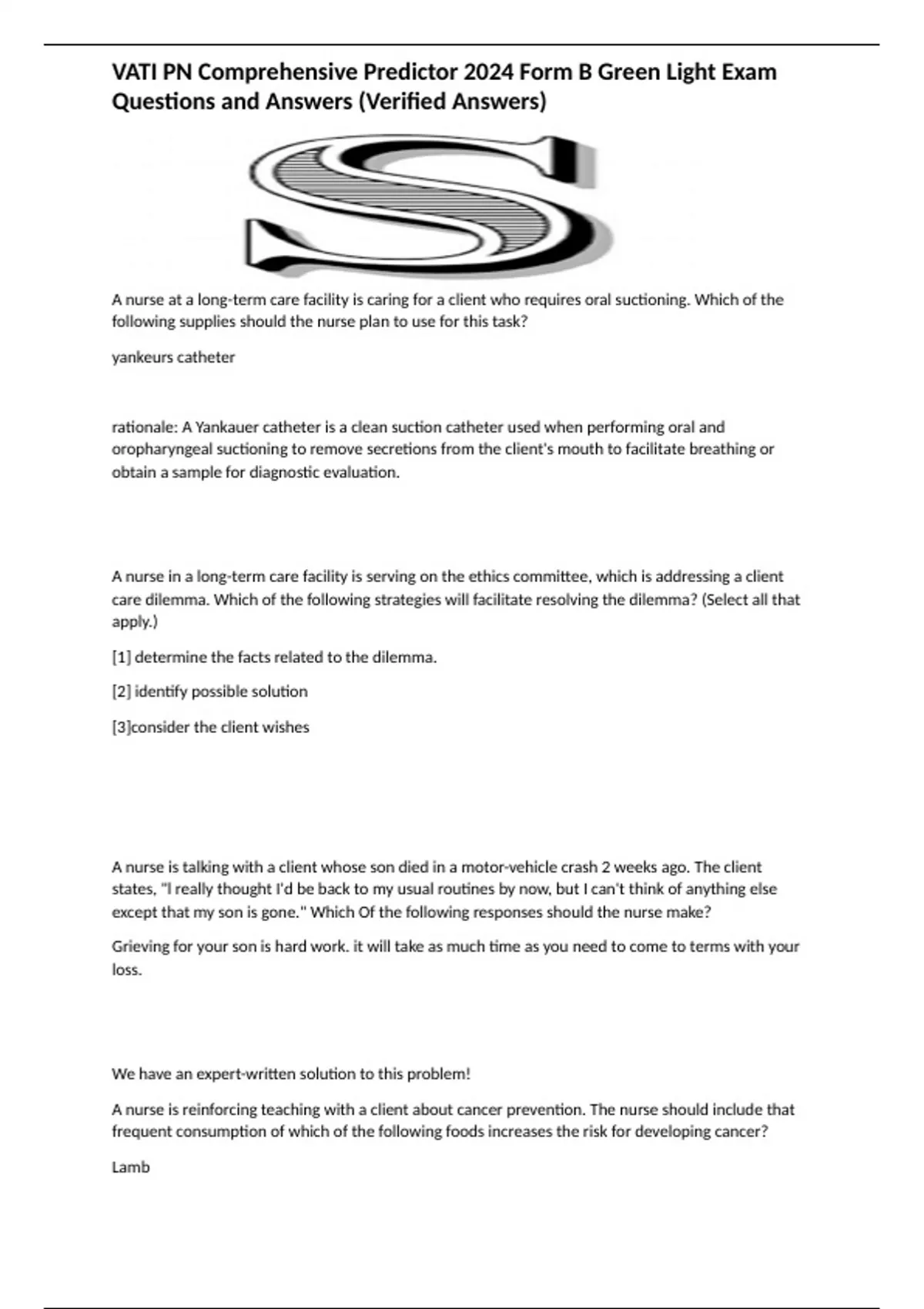 VATI PN Comprehensive Predictor 2024 Form B Green Light Exam Questions and Answers (Verified Answers)