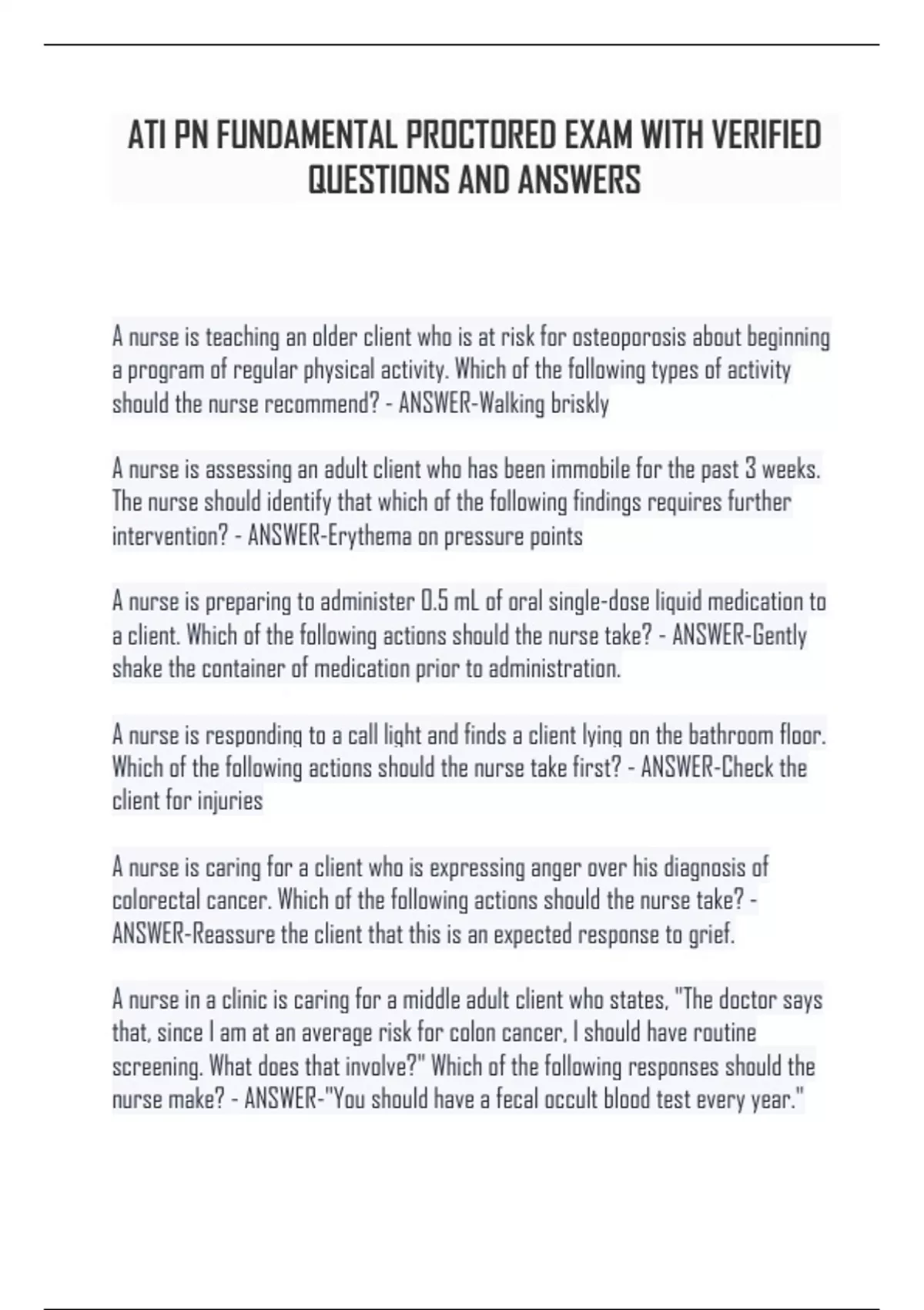 ATI PN FUNDAMENTAL PROCTORED EXAM WITH VERIFIED QUESTIONS AND ANSWERS A nurse is teaching an older client who is at risk for osteoporosis about beginning a program of regular physical activity. Which of the following types of activity should the nurse recommend? - ANSWER-Walking briskly A nurse is assessing an adult client who has been immobile for the past 3 weeks. The nurse should identify that which of the following findings requires further intervention? - ANSWER-Erythema on pressure points A nurse is preparing to administer 0.5 mL of oral single-dose liquid medication to a client. Which of the following actions should the nurse take? - ANSWER-Gently shake the container of medication prior to administration. A nurse is responding to a call light and finds a client lying on the bathroom floor. Which of the following actions should the nurse take first? - ANSWER-Check the client for injuries A nurse is caring for a client who is expressing anger over his diagnosis of colorectal cancer. Which of the following actions should the nurse take? - ANSWER-Reassure the client that this is an expected response to grief. A nurse in a clinic is caring for a middle adult client who states, "The doctor says that, since I am at an average risk for colon cancer, I should have routine screening. What does that involve?" Which of the following responses should the nurse make? - ANSWER-"You should have a fecal occult blood test every year." A nurse manager is preparing to review medication documentation with a group of newly licensed nurses. Which of the following statements should the nurse manager plan to include in the teaching? - ANSWER-"Use the complete name of the medication magnesium sulfate." A nurse is caring for a client who has tuberculosis. Which of the following actions should the nurse take? - ANSWER-Place the client in a room with negativepressure airflow. Wear gloves when assisting the client with oral care. Use antimicrobial sanitizer for hand hygiene. A nurse is caring for a client who requires a 24-hr urine collection. Which of the following statements by the client indicates an understanding of the teaching? - ANSWER-"I flushed what I urinated at 7:00 a.m. and have saved all urine since." A nurse is assessing a client who has been on bed rest for the past month. Which of the following findings should the nurse identify as an indication that the client has developed thrombophlebitis? - ANSWER-Calf swelling A nurse manager is overseeing the care on a unit. Which of the following situations should the nurse manager identify as a violation of HIPAA guidelines? - ANSWER-A nurse asks a nurse from another unit to assist with her documentation. A nurse is caring for a client who requires bed rest and has a prescription for antiembolic stockings. Which of the following actions should the nurse take? - ANSWER-Remove the stockings at least once per shift. A nurse is administering IV fluid to an older adult client. The nurse should perform which priority assessment to monitor for adverse effects? - ANSWER-Auscultate lung sounds A nurse is assessing a client's readiness to learn about insulin administration. Which of the following statements should the nurse identify as an indication that the client is ready to learn? - ANSWER-"I can concentrate best in the morning." A nurse is performing a Romberg's test during the physical assessment of a client. Which of the following techniques should the nurse use? - ANSWER-Have the client stand with her arms at her side and her feet together. A nurse is planning an deduction session for an older adult client who has just learned that she has type 2 diabetes mellitus. Which of the following strategies should the nurse plan to use with this client? - ANSWER-Allow extra time for the client to respond to questions A charge nurse is discussing the responsibility of nurses caring for clients who have Clostridium difficile infection. Which of the following information should the nurse include in the teaching? - ANSWER-Have family members wear a gown and gloves when visiting. A nurse in a surgical suite notes documentation on a client's medical record he has a latex allergy. In preparation for the client's procedure, which of the following precautions should the nurse take? - ANSWER-Wrap monitoring cords with stockinette and tape them in place. A nurse is caring for a client who is reporting difficulty falling asleep. Which of the following measures would the nurse recommend? - ANSWER-Use progressive relaxation techniques at bedtime. A nurse is caring for a client who has a prescription for 5 units of regular insulin and 10 units of NPH insulin to mix together and administer subcutaneously. Determine the correct order of steps for this procedure. - ANSWER-Air into NPH Air into Regular Draw up Regular Draw up NPH