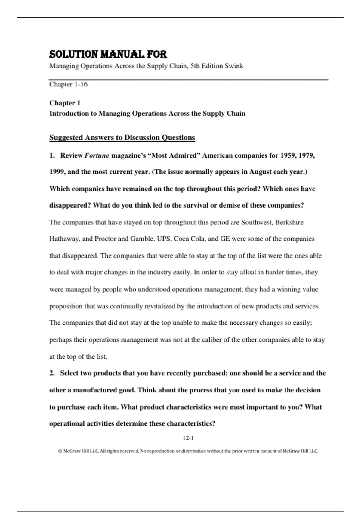 Solution Manual for Managing Operations Across the Supply Chain, 5th Edition by Morgan Swink, Steven Melnyk, Janet L. Hartley, M. Bixby Cooper. Part 1: SUPPLY CHAIN: A PERSPECTIVE FOR OPERATIONS MANAGEMENT Chapter 1: Introduction to Managing Operations Across the Supply Chain Chapter 2: Operations and Supply Chain Strategy Part 2: FOUNDATIONS OF OPERATIONS MANAGEMENT Chapter 3: Managing Processes and Capacity Chapter 3: Chapter Supplement: Process Mapping and Analysis Chapter 4: Product/Process Innovation Chapter 5: Manufacturing and Service Process Structures Chapter 6: Managing Quality Chapter 6: Chapter Supplement: Quality Improvement Tools Chapter 7: Managing Inventories Chapter 8: Lean Systems Part 3: INTEGRATING RELATIONSHIPS ACROSS THE SUPPLY CHAIN Chapter 9: Customer Service Management Chapter 10: Sourcing and Supply Management Chapter 11: Logistics Management Part 4: PLANNING FOR INTEGRATED OPERATIONS ACROSS THE SUPPLY CHAIN Chapter 12: Demand Planning: Forecasting and Demand Management Chapter 13: Sales and Operations Planning Chapter 14: Materials and Resource Requirements Planning