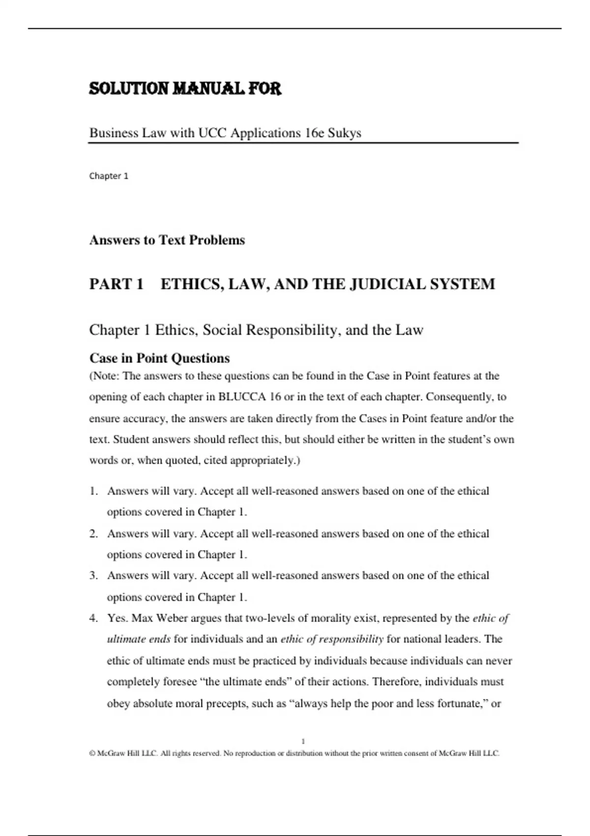 Solution Manual for Business Law with UCC Applications 16Edition by Paul Sukys. PART ONE: ETHICS, LAW, AND THE JUDICIAL SYSTEM Chapter 1: Ethics and the Law Chapter 2: Sources of the Law Chapter 3: The Judicial Process and Cyber-Procedure Chapter 4: Alternative Dispute Resolution and Cyber-ADR Chapter 5: Criminal Law and Cybercrimes Chapter 6: Tort Law and Cybertorts Case Study: Roman Catholic Diocese of Brooklyn, New York v. Andrew M. Cuomo Governor of New York PART TWO: CONTRACT LAW Chapter 7: The Essentials of Contract Law Chapter 8: Offer, Acceptance, and Mutual Assent Chapter 9: Consideration and Cyber-Payments Chapter 10: Capacity and Legality: The Final Elements Chapter 11: Written Contracts and Cyber-Commerce Chapter 12: Assignment, Discharge, and Remedies Case Study: Sylvia Burwell, Secretary of Health and Human Services, et al. v. Hobby Lobby Stores, Inc., et al. (AKA The Hobby Lobby Case) PART THREE: SALES AND CONSUMER PROTECTION Chapter 13: Sales Contracts: Formation, Title, and Risk of Loss Chapter 14: Sales Contracts: Rights, Duties, Breach, and Warranties Chapter 15: Product Liability and Consumer Protection Case Study: Pritchard v. Liggett and Myers Tobacco Company PART FOUR: NEGOTIABLE INSTRUMENTS AND BANKING Chapter 16: The Nature of Negotiable Instruments Chapter 17: Holders in Due Course, Defenses, and Liabilities Chapter 18: Bank–Depositor Relationships and Cyber-Banking Case Study: Bowling Green, Inc., v. State Street Bank and Trust Company PART FIVE: INSURANCE, SECURED TRANSACTIONS, AND BANKRUPTCY Chapter 19: Insurance Chapter 20: Mortgages, Land Contracts, and the 21st-Century Financial Crisis Chapter 21: Bankruptcy Law: In Theory, in History, and in Practice Case Study: Superior Savings Association v. City of Cleveland PART SIX: AGENCY AND EMPLOYMENT Chapter 22: Agency Law Chapter 23: Employment Law Chapter 24: Labor Law Case Study: Bethany College and Thomas Jorsch and Lisa Guinn 781 PART SEVEN: BUSINESS ORGANIZATION AND REGULATION Chapter 25: The Business Entity: An Introduction Chapter 26: The Corporate Entity Chapter 27: Managing the Corporate Entity Chapter 28: Government Regulation of the Corporate Entity Case Study: Gries Sports Enterprises, Inc. v. Cleveland, Browns Football Co., Inc., PART EIGHT: PROPERTY LAW Chapter 29: Personal Property and Bailments Chapter 30: Real Property and Landlord and Tenant Law Chapter 31: Wills, Advance Directives, and Trusts Case Study: Obergefell, et al., v. Hodges, Director, Ohio Department of Health, et al. PART NINE: THE LEGAL ENVIRONMENT Chapter 32: Professional Liability Chapter 33: Science, Technology, and Law in the 21st Century Chapter 34: International Law and the New World Order