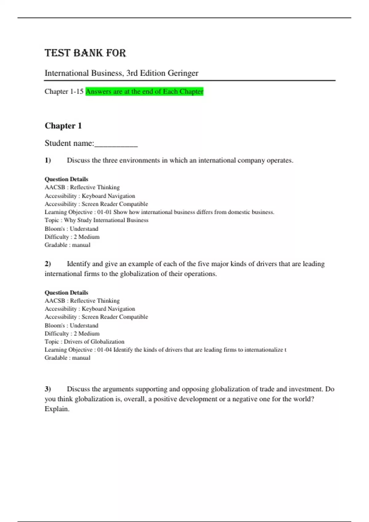 Test Bank for International Business, 3rd Edition by Michael Geringer and Jeanne McNett. Chapter 1 The Challenging Context of International Business module 2 International Trade and Investment module 3 Sociocultural Forces module 4 Sustainability and Natural Resources module 5 Political Forces That Affect Global Trade module 6 Intellectual Property Rights and Other Legal Forces module 7 Economic and Socioeconomic Forces module 8 The International Monetary System and Financial Forces module 9 International Competitive Strategy module 10 Organizational Design and Control module 11 Global Leadership Issues and Practices module 12 International Markets: Assessment and Entry Modes module 13 Marketing Internationally module 14 Managing Human Resources in an International Context module 15 International Accounting and Financial Management