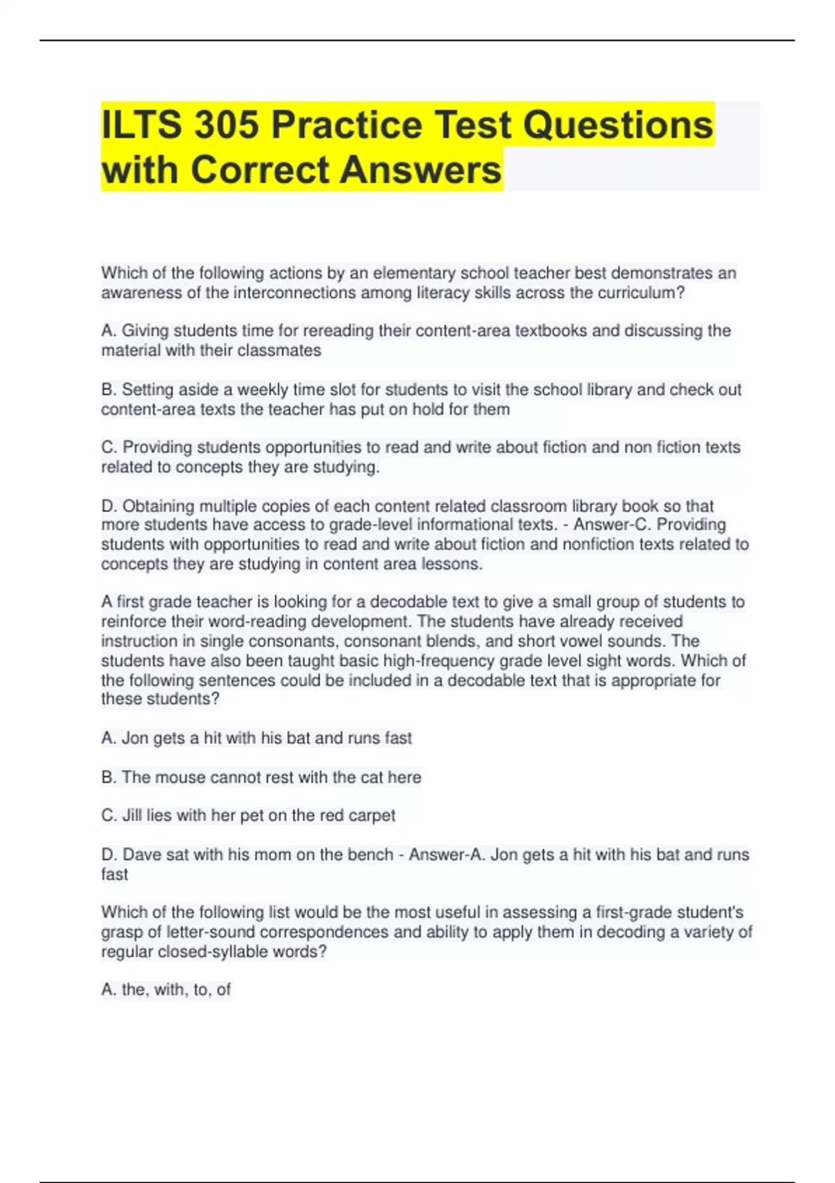 ILTS 305 Practice Test Questions with Correct Answer Which of the following actions by an elementary school teacher best demonstrates an awareness of the interconnections among literacy skills across the curriculum? A. Giving students time for rereading their content-area textbooks and discussing the material with their classmates B. Setting aside a weekly time slot for students to visit the school library and check out content-area texts the teacher has put on hold for them C. Providing students opportunities to read and write about fiction and non fiction texts related to concepts they are studying. D. Obtaining multiple copies of each content related classroom library book so that more students have access to grade-level informational texts. - Answer-C. Providing students with opportunities to read and write about fiction and nonfiction texts related to concepts they are studying in content area lessons. A first grade teacher is looking for a decodable text to give a small group of students to reinforce their word-reading development. The students have already received instruction in single consonants, consonant blends, and short vowel sounds. The students have also been taught basic high-frequency grade level sight words. Which of the following sentences could be included in a decodable text that is appropriate for these students? A. Jon gets a hit with his bat and runs fast B. The mouse cannot rest with the cat here C. Jill lies with her pet on the red carpet D. Dave sat with his mom on the bench - Answer-A. Jon gets a hit with his bat and runs fast Which of the following list would be the most useful in assessing a first-grade student's grasp of letter-sound correspondences and ability to apply them in decoding a variety of regular closed-syllable words? A. the, with, to, of B. main, beat, coat, foot C. dot, pen, sum, rib D. bat, cat, mat, sat - Answer-C. dot, pen, sum, rib Fourth grade students have read an informational text about types of storms, and they are having a classroom discussion about extreme weather. During the discussion, they work together on the partially completed grid below as they decided which features are characteristic of the various storm types. This type of activity is most likely promote students vocabulary development? A. Demonstrating understanding of words by relating them to their synonyms B. Defining words in relation to the content area texts they are reading C. Analyzing the nuances of meaning between related words D. Identifying meaningful examples of new concepts - Answer-C. Analyzing the nuances of meaning bet2ween related words A 6th grade class is learning about rocks as part of a science unit on Earth's systems. The teacher has assigned students to read the passage below. Which of the following student responses to the passage most clearly suggests to the teacher that the student is applying inferential comprehension skills? A. Magma is melted material that hardens into crystals as it cools. B. Large crystals would take a long time to for from the magma C. Magma is an extremely hot liquid when it is flowing toward the surface D. Rocks with small crystals cooled more quickly than those with large crystals - Answer-B. Large crystals would take long time to form from the magma What is inferential comprehension skills? - Answer-Ability to process written information and understand the underlying meaning of the text. A third grade teacher is planning to conduct a close reading of a nonfiction historical narrative. The teacher is selecting general-academic and content-specific words from the text to teacher explicitly to the class during the reading. Which of the following prereading strategies would best address the linguistic needs of an emerging level English language learner in the class? A. Selecting Tier One words from the text to preach to the student explicitly B. Providing the student with a vocabulary notebook for writing down unknown words C. Having the student look through the text and identify unfamiliar words by circling them D. Giving instruction in dictionary usage and letting the student practice looking up words from the text. - Answer-A. Selecting Tier One words from the text to preach to the student explicitly A first grade teacher plans to use a graphic organizer to guide students in identifying and analyzing key ideas and details in an informational text. Which of the following types of graphic organizers would be most appropriate for the teacher to use for this purpose? A. Venn diagram B. KWL Chart C. FlowChart D. Semantic Map - Answer-D. Semantic Map Semantic Map - Answer-Focus on a central theme or topic. Connected words and phrases radiate outward from the central topic. Several students in an elementary school classroom are English language learners. The teacher would like to differentiate instruction to promote development of their ability to comprehend and analyze informational texts. Which of the following strategies would be most effective for the teacher to use for this purpose? A. Encouraging the students to ask the teacher questions about what they read B. Pairing the students with peers who share the same home language C. Having this student use a dictionary to translate texts into English D. Providing the students with scaffolding to help them access the texts' content - Answer-D. Providing the students with scaffolding to help them access the texts' content.
