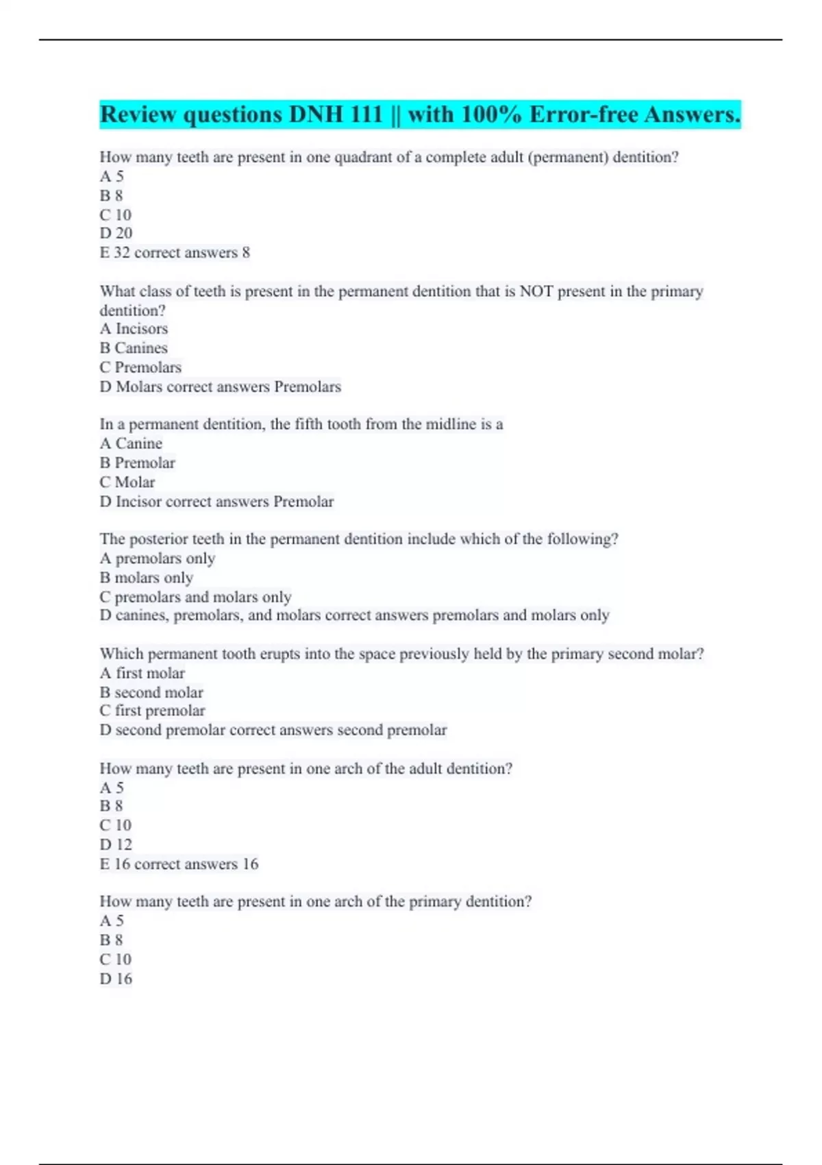How many teeth are present in one quadrant of a complete adult (permanent) dentition? A 5 B 8 C 10 D 20 E 32 correct answers 8 What class of teeth is present in the permanent dentition that is NOT present in the primary dentition? A Incisors B Canines C Premolars D Molars correct answers Premolars In a permanent dentition, the fifth tooth from the midline is a A Canine B Premolar C Molar D Incisor correct answers Premolar The posterior teeth in the permanent dentition include which of the following? A premolars only B molars only C premolars and molars only D canines, premolars, and molars correct answers premolars and molars only Which permanent tooth erupts into the space previously held by the primary second molar? A first molar B second molar C first premolar D second premolar correct answers second premolar How many teeth are present in one arch of the adult dentition? A 5 B 8 C 10 D 12 E 16 correct answers 16 How many teeth are present in one arch of the primary dentition? A 5 B 8 C 10 D 16