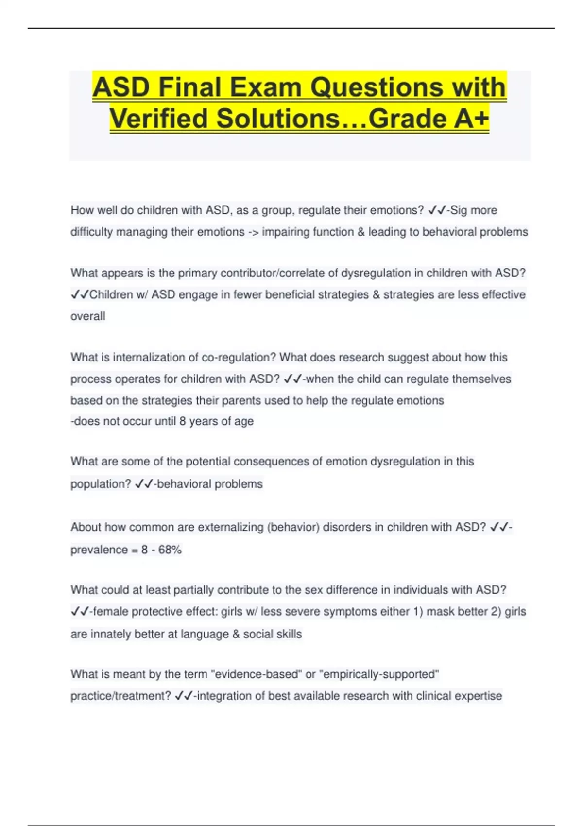 ASD Final Exam Questions with Verified Solutions…Grade A+ How well do children with ASD, as a group, regulate their emotions? -Sig more difficulty managing their emotions -> impairing function & leading to behavioral problems What appears is the primary contributor/correlate of dysregulation in children with ASD? Children w/ ASD engage in fewer beneficial strategies & strategies are less effective overall What is internalization of co-regulation? What does research suggest about how this process operates for children with ASD? -when the child can regulate themselves based on the strategies their parents used to help the regulate emotions -does not occur until 8 years of age What are some of the potential consequences of emotion dysregulation in this population? -behavioral problems About how common are externalizing (behavior) disorders in children with ASD? - prevalence = 8 - 68% What could at least partially contribute to the sex difference in individuals with ASD? -female protective effect: girls w/ less severe symptoms either 1) mask better 2) girls are innately better at language & social skills