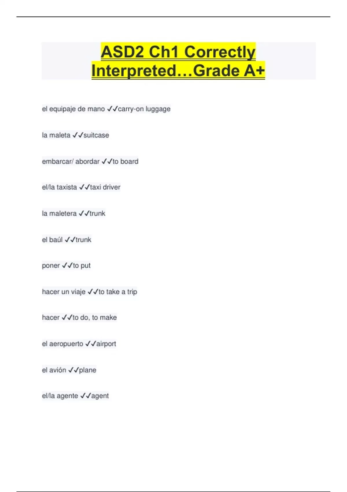 ASD2 Ch1 Correctly Interpreted…Grade A+ el equipaje de mano carry-on luggage la maleta suitcase embarcar/ abordar to board el/la taxista taxi driver la maletera trunk el baúl trunk poner to put hacer un viaje to take a trip hacer to do, to make el aeropuerto airport el avión plane el/la agente agent