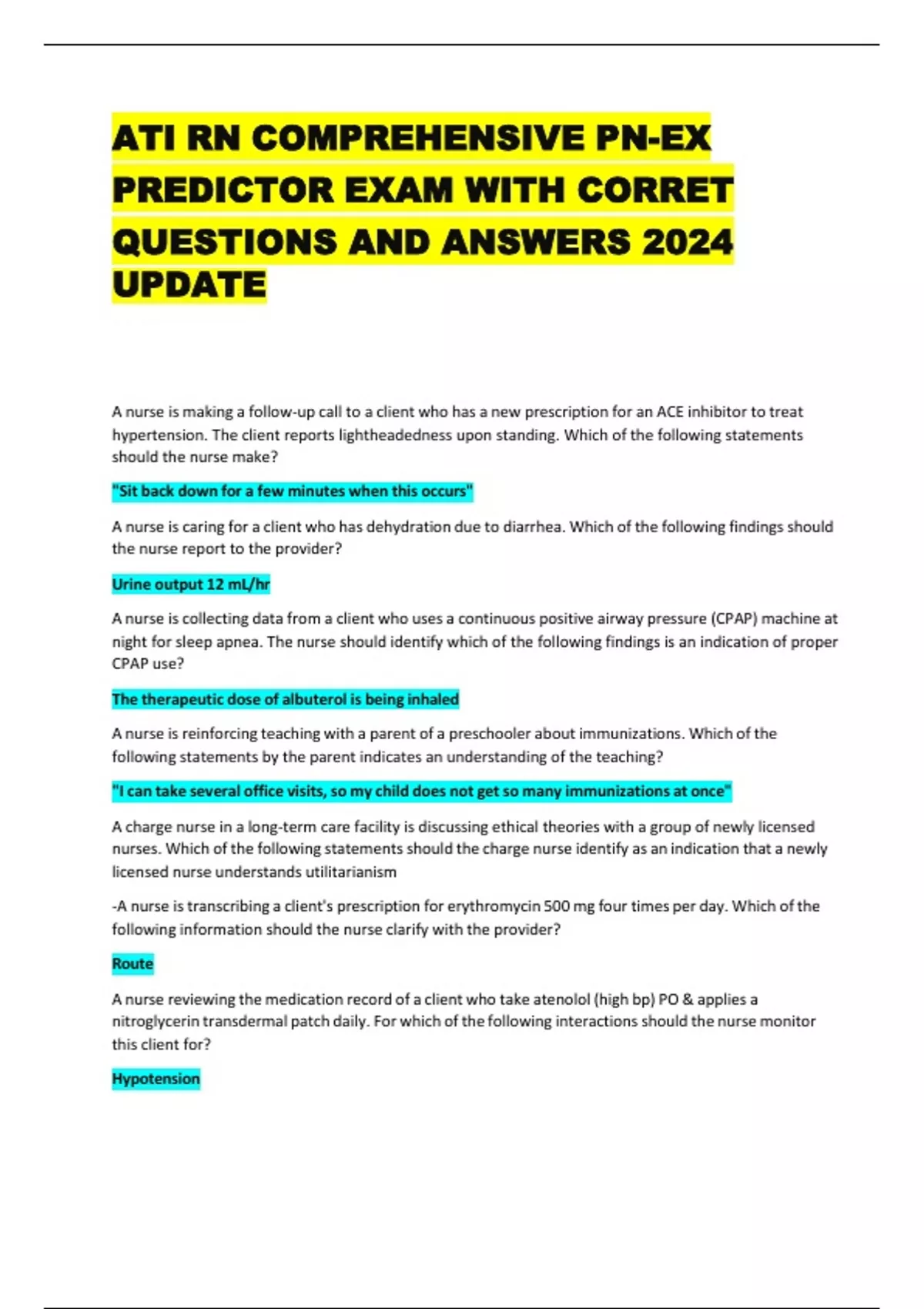 ATI RN COMPREHENSIVE PN-EX PREDICTOR EXAM WITH CORRET QUESTIONS AND ANSWERS 2024 UPDATE