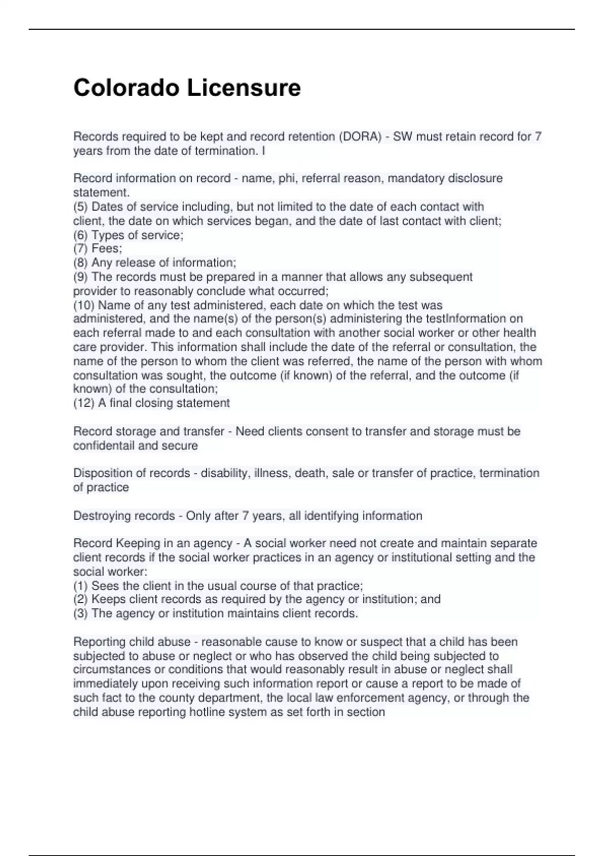 Colorado Licensure rated A+ Records required to be kept and record retention (DORA) - SW must retain record for 7 years from the date of termination. I Record information on record - name, phi, referral reason, mandatory disclosure statement. (5) Dates of service including, but not limited to the date of each contact with client, the date on which services began, and the date of last contact with client; (6) Types of service; (7) Fees; (8) Any release of information; (9) The records must be prepared in a manner that allows any subsequent provider to reasonably conclude what occurred; (10) Name of any test administered, each date on which the test was administered, and the name(s) of the person(s) administering the testInformation on each referral made to and each consultation with another social worker or other health care provider. This information shall include the date of the referral or consultation, the name of the person to whom the client was referred, the name of the person with whom consultation was sought, the outcome (if known) of the referral, and the outcome (if known) of the consultation; (12) A final closing statement Record storage and transfer - Need clients consent to transfer and storage must be confidentail and secure Disposition of records - disability, illness, death, sale or transfer of practice, termination of practice Destroying records - Only after 7 years, all identifying information Record Keeping in an agency - A social worker need not create and maintain separate client records if the social worker practices in an agency or institutional setting and the social worker: (1) Sees the client in the usual course of that practice; (2) Keeps client records as required by the agency or institution; and (3) The agency or institution maintains client records. Reporting child abuse - reasonable cause to know or suspect that a child has been subjected to abuse or neglect or who has observed the child being subjected to circumstances or conditions that would reasonably result in abuse or neglect shall immediately upon receiving such information report or cause a report to be made of such fact to the county department, the local law enforcement agency, or through the child abuse reporting hotline system as set forth in section