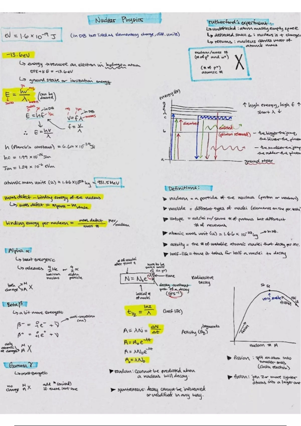 One page study guide on nuclear physics. Includes Rutherford's experiment, binding energy, radioactive decay, activity, fission, fusion, and emission and absorption spectrum of various gases. Made and used by 4.0 student.
