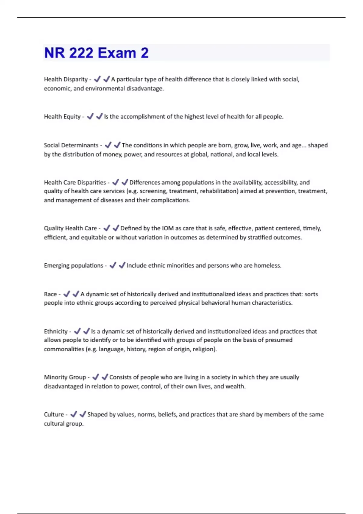 Health Disparity - A particular type of health difference that is closely linked with social, economic, and environmental disadvantage. Health Equity - Is the accomplishment of the highest level of health for all people. Social Determinants - The conditions in which people are born, grow, live, work, and age... shaped by the distribution of money, power, and resources at global, national, and local levels. Health Care Disparities - Differences among populations in the availability, accessibility, and quality of health care services (e.g. screening, treatment, rehabilitation) aimed at prevention, treatment, and management of diseases and their complications. Quality Health Care - Defined by the IOM as care that is safe, effective, patient centered, timely, efficient, and equitable or without variation in outcomes as determined by stratified outcomes. Emerging populations - Include ethnic minorities and persons who are homeless. Race - A dynamic set of historically derived and institutionalized ideas and practices that: sorts people into ethnic groups according to perceived physical behavioral human characteristics. Ethnicity - Is a dynamic set of historically derived and institutionalized ideas and practices that allows people to identify or to be identified with groups of people on the basis of presumed commonalities (e.g. language, history, region of origin, religion). Minority Group - Consists of people who are living in a society in which they are usually disadvantaged in relation to power, control, of their own lives, and wealth. Culture - Shaped by values, norms, beliefs, and practices that are shard by members of the same cultural group.Intersectionality - The dynamic perspective that we all belong simultaneously to multiple social groups within changing social and political contexts. Oppression - System of advantages and disadvantages tied to our membership in social groups. Values - Beliefs of the worth of something and serve as standards that influence behavior and thinking. Value orientations - Are learned and shard thorough the socialization process, reflect, the personality type of a particular society. Cultural Competency - One of the major elements in eliminating health disparities; it starts with an honest desire to disregard personal biases and to treat every person with respect. Enabling of health care providers to deliver services that are respectful of and responsive to the health beliefs, practices, and cultural and linguistic needs of diverse patients. Transcultural Nursing - A comparative study of cultures to understand their similarities and differences among them. Culturally Congruent Care - Care that fits a persons life patterns, values, and system of meaning; bridge cultural gaps to provide meaningful and supportive care for all patients. Cultural Awareness - An in-depth self-examination of one's own background, recognizing biases, prejudices, and assumptions about other people. Cultural Knowledge - Sufficient comparative knowledge of diverse groups, including the values, health beliefs, care practices, world view, and bicultural ecology commonly found within each group. Cultural Skills - Ability to assess social, cultural, and biophysical factors that influence patient treatment and care.Cultural Encounters - Cross-cultural interactions that provide opportunities to learn about other cultures and develop effective intercultural communication. Cultural Desire - The motivation and commitment to caring that moves an individual to learn from others, accept the role as a learner, be open to and accepting of cultural differences, and build on cultural similarities. Professional Care Systesm - Characterized by specialized education and knowledge, responsibility for care, and expectation of remuneration of services rendered. Folk Healing System - Embodies the beliefs, values, and treatment approaches of a particular cultural group that are products of cultural development (ex. herbalists, spiritualists, lay midwives). Arab American Health Issues - Adult-onset diabetes, coronary artery disease, cardiovascular disease, mental health, tobacco consumption, hypertension, and heart disease. Arab American Risk Factors - Obesity, low employment rates, tobacco consumption (mostly Shisha and cigarettes), acculturation (age of migration, and length of stay can affect this). Arab American Barriers - Religious beliefs and practices, cultural norms relating to modesty, family values of upholding family's reputation, gender issues (prefer same-sex provider), folk remedies, stresses of assimilation and acculturation, and lack of culturally competent services (due to stereotyping and discrimination). Arab American Cultural Aspects - Customs center on food, family, and friends; families are large; religion (restrictions on diet, and prayer rituals); present oriented and view future as uncertain. Asian American Health Issues - Cancer (stomach), heart disease, stroke, unintentional injuries, diabetes, COPD, Hep B, HIV/AIDS, tuberculosis, liver disease, and mental health. Asian American Risk Factors - Smoking, drinking, and infrequent medical visits.Asian American Barriers - Language/cultural, lack of health insurance, fear of transportation, won't question authority, sex is a taboo topic, hesitant to seek health care, and poverty. Asian American Cultural Aspects - Family is the most important institution, honor of the family is more important than the individual, oldest male is decision maker, folk medicine (taoism, chi, yin/yang, herbs, accupuncture. Latino American Health Issues - Heart disease, cancer, HIV/AIDS, stroke, diabetes, cardiovascular disease, asthma, COPD, mental health, and liver disease. Latino American Risk Factors - Obesity.