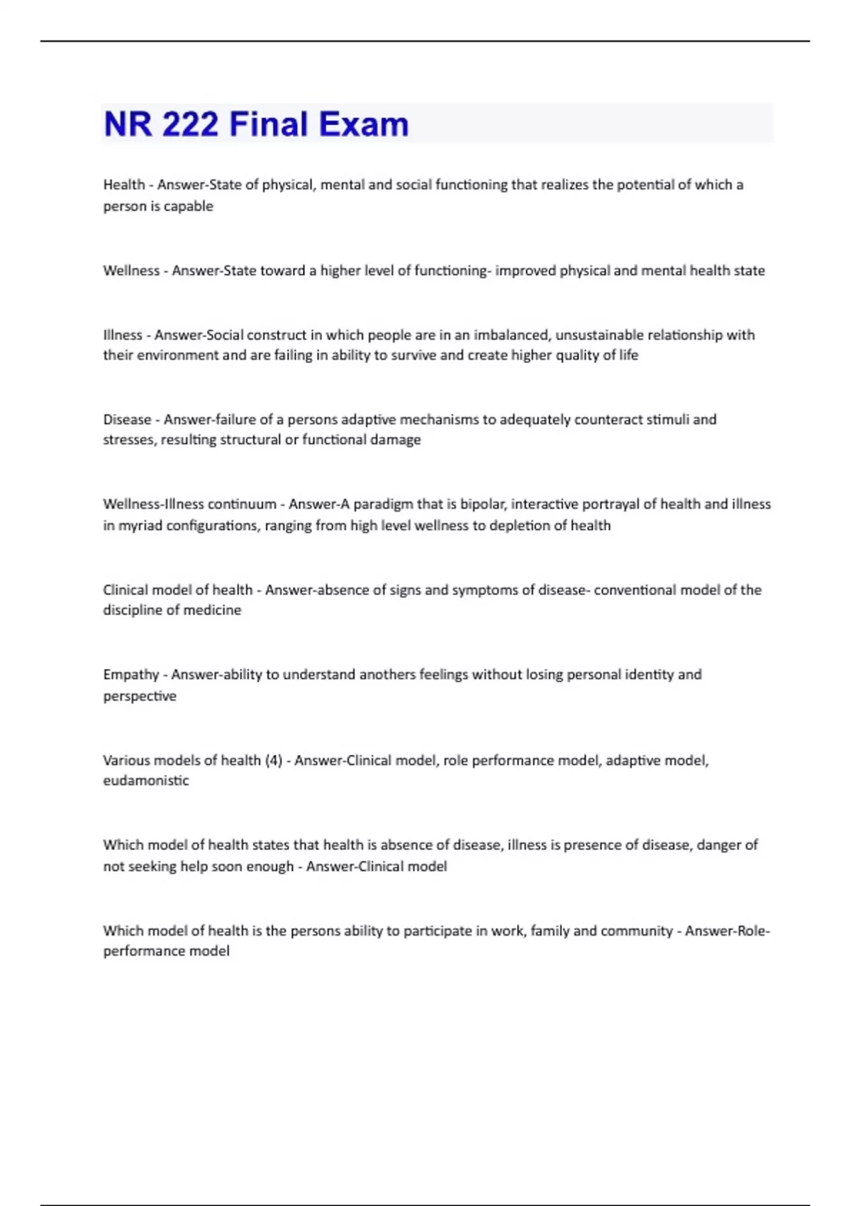 Health - Answer-State of physical, mental and social functioning that realizes the potential of which a person is capable Wellness - Answer-State toward a higher level of functioning- improved physical and mental health state Illness - Answer-Social construct in which people are in an imbalanced, unsustainable relationship with their environment and are failing in ability to survive and create higher quality of life Disease - Answer-failure of a persons adaptive mechanisms to adequately counteract stimuli and stresses, resulting structural or functional damage Wellness-Illness continuum - Answer-A paradigm that is bipolar, interactive portrayal of health and illness in myriad configurations, ranging from high level wellness to depletion of health Clinical model of health - Answer-absence of signs and symptoms of disease- conventional model of the discipline of medicine Empathy - Answer-ability to understand anothers feelings without losing personal identity and perspective Various models of health (4) - Answer-Clinical model, role performance model, adaptive model, eudamonistic Which model of health states that health is absence of disease, illness is presence of disease, danger of not seeking help soon enough - Answer-Clinical model Which model of health is the persons ability to participate in work, family and community - Answer-Roleperformance modelWhich model of health is the ability to positively make changes in health conditions - Answer-Adaptive model Which model of health states that the exuberant well-being indicates optimal health - AnswerEudamonistic model Helps to guide health system to promote health, helps to form healthcare for everybody, eliminates health disparity, increases healthy life span and provides preventative care. - Answer-Health people 2020 Levels of prevention - Answer-Primary- prevention Secondary- Assessment and Treatment Tertiary- Follow up care Which level of prevention is the prevention of smoking - Answer-Primary Which level of prevention is the care of respiratory patient - Answer-Secondary Which level of prevention is promotion strategies to improve life with COPD - Answer-Tertiary Gordons 11 functional health patterns - Answer-Health-perception/health-management Nutritional-metabolic Elimination Activity-Exercise Sleep-rest Cognitive-Perceptual Self-perception/concept Roles-relationships Sexuality-Reproductive Coping-stress tolerance Values-beliefsAcculturation - Answer-Adapting to or borrowing traits from another culture Culture - Answer-Shared patterns of values/behaviors- shaped by cultural group Ethnic group - Answer-Group set apart on basis of cultural/national origin characteristics Ethnicity - Answer-Sense of collective identity, distinctiveness, sharing of customs, food, dress, language Health disparities - Answer-Wide variations in health services/health status among certain population groups Race - Answer-Categorizations of people based on physical properties and biological heredity Trans-cultural nursing - Answer-transforms health care for diverse populations Values clarification - Answer-Method for discovering ones values and the importance of these values What are considered to be the emerging populations in the United States? - Answer-Ethnic minorities, homeless, those with AIDS/HIV What are considered to be the primary health concerns for the homeless population? - Answer-Survival issues, respiratory or infectious disease; dental/vision problems; mental health and substance abuse What are considered to be the primary health concerns for the Arab population? - Answer-Diabetes, coronary heart disease, acculturation, mental health, teen smoking What are considered to be the primary health concerns for the Asian population? - Answer-Hesitancy for care, tuberculosis, mental healthWhat are considered to be the primary health concerns for the Hispanic population? - Answer-Stomach cancer, diabetes, CV disease, HIV What are considered to be the primary health concerns for the Black population? - Answer-Cancer, HIV, hypertension, obesity, mental health What are considered to be the primary health concerns for the Native American population? - AnswerSmoking, substance abuse, cirrhosis, diabetes, suicide Advanced Practice nurses - Answer-Nurses with advanced education beyond BA- manage and deliver health care services to all Advocate - Answer-One who pleads the cause of another Health care reform - Answer-Obamacare Health Maintenance Organization - Answer-the prototypical managed care structure that encompasses 2 possibilities: health plan where providers assume the financial risk OR a health plan that uses primary care providers as gatekeepers. Hospitalist - Answer-a physician whose professional focus is caring for hospitalized individuals Lobbyist - Answer-Registered representative of a special interest group Managed care - Answer-System that seeks to manage the cost, quality, and access of health care. Medicaid - Answer-Combined federal and state program- provides access to care for the poor and medically needy of all ages Medicare - Answer-federal health insurance program that finacnces health care for those over 65, those disable, and those with end-stage renal diseasePreferred Provider Organizations - Answer-Network of providers who agree to deliver serviced for discounted fee -no financial risk to provide Primary Care - Answer-basic health care that emphasizes health needs rather than specialized carePREVENTION What is CMS and what do they do? - Answer-Centers for Medicare/Medicare and CHIP. Branch of US dept of health and human services. Federal agency which administers Medicare, Medicaid and CHIP; and provides info to health professions, regional governments and consumers.