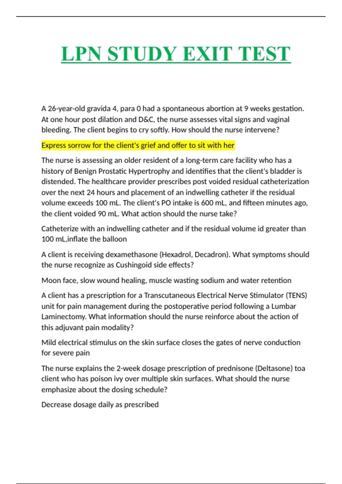 LPN STUDY EXIT TEST A 26-year-old gravida 4, para 0 had a spontaneous abortion at 9 weeks gestation. At one hour post dilation and D&C, the nurse assesses vital signs and vaginal bleeding. The client begins to cry softly. How should the nurse intervene? Express sorrow for the client's grief and offer to sit with her The nurse is assessing an older resident of a long-term care facility who has a history of Benign Prostatic Hypertrophy and identifies that the client's bladder is distended. The healthcare provider prescribes post voided residual catheterization over the next 24 hours and placement of an indwelling catheter if the residual volume exceeds 100 mL. The client's PO intake is 600 mL, and fifteen minutes ago, the client voided 90 mL. What action should the nurse take? Catheterize with an indwelling catheter and if the residual volume id greater than 100 mL,inflate the balloon A client is receiving dexamethasone (Hexadrol, Decadron). What symptoms should the nurse recognize as Cushingoid side effects? Moon face, slow wound healing, muscle wasting sodium and water retention A client has a prescription for a Transcutaneous Electrical Nerve Stimulator (TENS) unit for pain management during the postoperative period following a Lumbar Laminectomy. What information should the nurse reinforce about the action of this adjuvant pain modality? Mild electrical stimulus on the skin surface closes the gates of nerve conduction for severe pain The nurse explains the 2-week dosage prescription of prednisone (Deltasone) toa client who has poison ivy over multiple skin surfaces. What should the nurse emphasize about the dosing schedule? Decrease dosage daily as prescribed