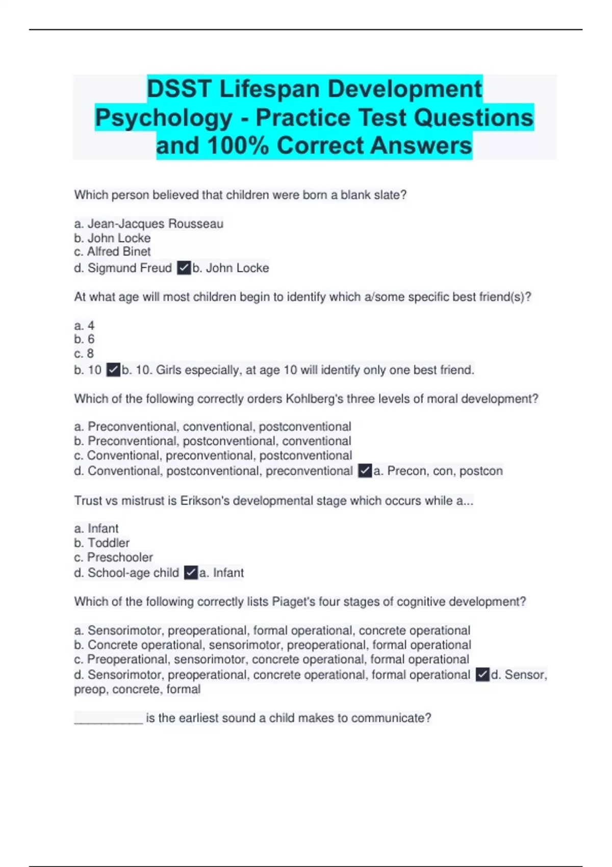 Which person believed that children were born a blank slate? a. Jean-Jacques Rousseau b. John Locke c. Alfred Binet d. Sigmund Freud b. John Locke At what age will most children begin to identify which a/some specific best friend(s)? a. 4 b. 6 c. 8 b. 10 b. 10. Girls especially, at age 10 will identify only one best friend. Which of the following correctly orders Kohlberg's three levels of moral development? a. Preconventional, conventional, postconventional b. Preconventional, postconventional, conventional c. Conventional, preconventional, postconventional d. Conventional, postconventional, preconventional a. Precon, con, postcon Trust vs mistrust is Erikson's developmental stage which occurs while a... a. Infant b. Toddler c. Preschooler d. School-age child a. Infant Which of the following correctly lists Piaget's four stages of cognitive development? a. Sensorimotor, preoperational, formal operational, concrete operational b. Concrete operational, sensorimotor, preoperational, formal operational c. Preoperational, sensorimotor, concrete operational, formal operational d. Sensorimotor, preoperational, concrete operational, formal operational d. Sensor, preop, concrete, formal __________ is the earliest sound a child makes to communicate?
