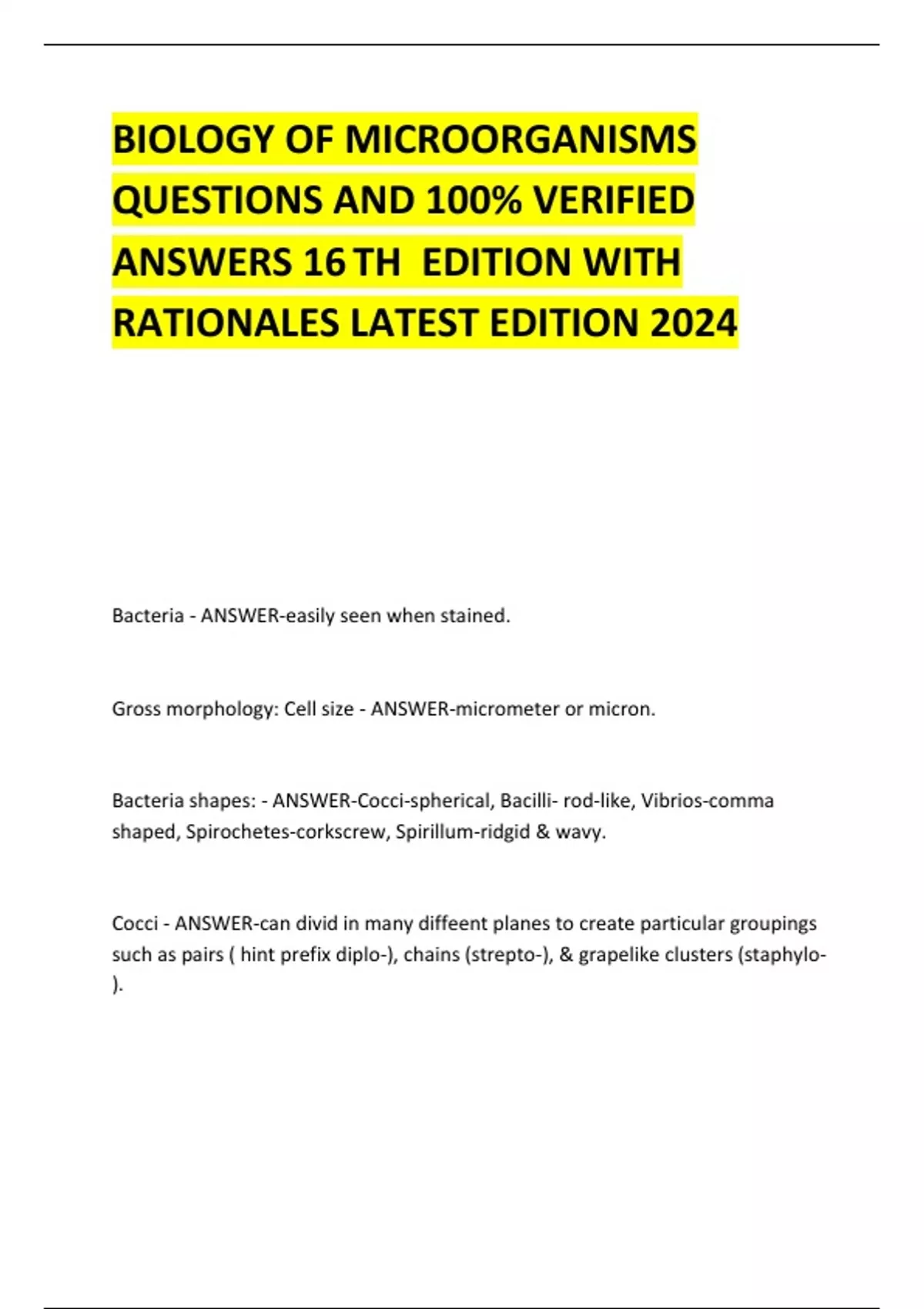 BIOLOGY OF MICROORGANISMS QUESTIONS AND 100% VERIFIED ANSWERS 16 TH EDITION WITH RATIONALES LATEST EDITION 2024