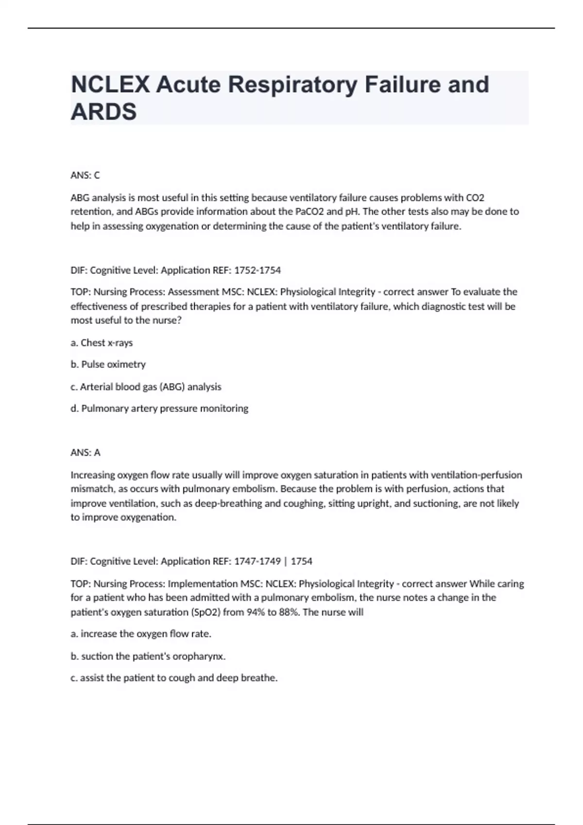 NCLEX Acute Respiratory Failure and ARDSANS: C ABG analysis is most useful in this setting because ventilatory failure causes problems with CO2 retention, and ABGs provide information about the PaCO2 and pH. The other tests also may be done to help in assessing oxygenation or determining the cause of the patient's ventilatory failure. DIF: Cognitive Level: Application REF: TOP: Nursing Process: Assessment MSC: NCLEX: Physiological Integrity - correct answer To evaluate the effectiveness of prescribed therapies for a patient with ventilatory failure, which diagnostic test will be most useful to the nurse? a. Chest x-rays b. Pulse oximetry c. Arterial blood gas (ABG) analysis d. Pulmonary artery pressure monitoring ANS: A Increasing oxygen flow rate usually will improve oxygen saturation in patients with ventilation-perfusion mismatch, as occurs with pulmonary embolism. Because the problem is with perfusion, actions that improve ventilation, such as deep-breathing and coughing, sitting upright, and suctioning, are not likely to improve oxygenation. DIF: Cognitive Level: Application REF: | 1754 TOP: Nursing Process: Implementation MSC: NCLEX: Physiological Integrity - correct answer While caring for a patient who has been admitted with a pulmonary embolism, the nurse notes a change in the patient's oxygen saturation (SpO2) from 94% to 88%. The nurse will a. increase the oxygen flow rate. b. suction the patient's oropharynx. c. assist the patient to cough and deep breathe. d. help the patient to sit in a more upright position. ANS: B The patient's lethargy, low respiratory rate, and SpO2 indicate the need for mechanical ventilation with ventilator-controlled respiratory rate. Administration of high flow oxygen will not be helpful because the patient's respiratory rate is so low. Insertion of a mini-tracheostomy will facilitate removal of secretions, but it will not improve the patient's respiratory rate or oxygenation. BiPAP requires that the patient initiate an adequate respiratory rate to allow adequate gas exchange. DIF: Cognitive Level: Application REF: TOP: Nursing Process: Planning MSC: NCLEX: Physiological Integrity - correct answer A patient with respiratory failure has a respiratory rate of 8 and an SpO2 of 89%. The patient is increasingly lethargic. The nurse will anticipate assisting with a. administration of 100% oxygen by non-rebreather mask. b. endotracheal intubation and positive pressure ventilation. c. insertion of a mini-tracheostomy with frequent suctioning. d. initiation of bilevel positive pressure ventilation (BiPAP). ANS: C The patient's assessment indicates that assisted coughing is needed to help remove secretions, which will improve oxygenation. A 2-hour rest period at this time may allow the oxygen saturation to drop further. Humidification will not be helpful unless the secretions can be mobilized. Positioning on the right side may cause a further decrease in oxygen saturation because perfusion will be directed more toward the more poorly ventilated lung. DIF: Cognitive Level: Application REF: TOP: Nursing Process: Implementation MSC: NCLEX: Physiological Integrity - correct answer The pulse oximetry for a patient with right lower lobe pneumonia indicates an oxygen saturation of 90%. The patient has rhonchi, a weak cough effort, and complains of fatigue. Which action is best for the nurse to take? a. Position the patient on the right side. b. Place a humidifier in the patient's room. c. Assist the patient with staged coughing.