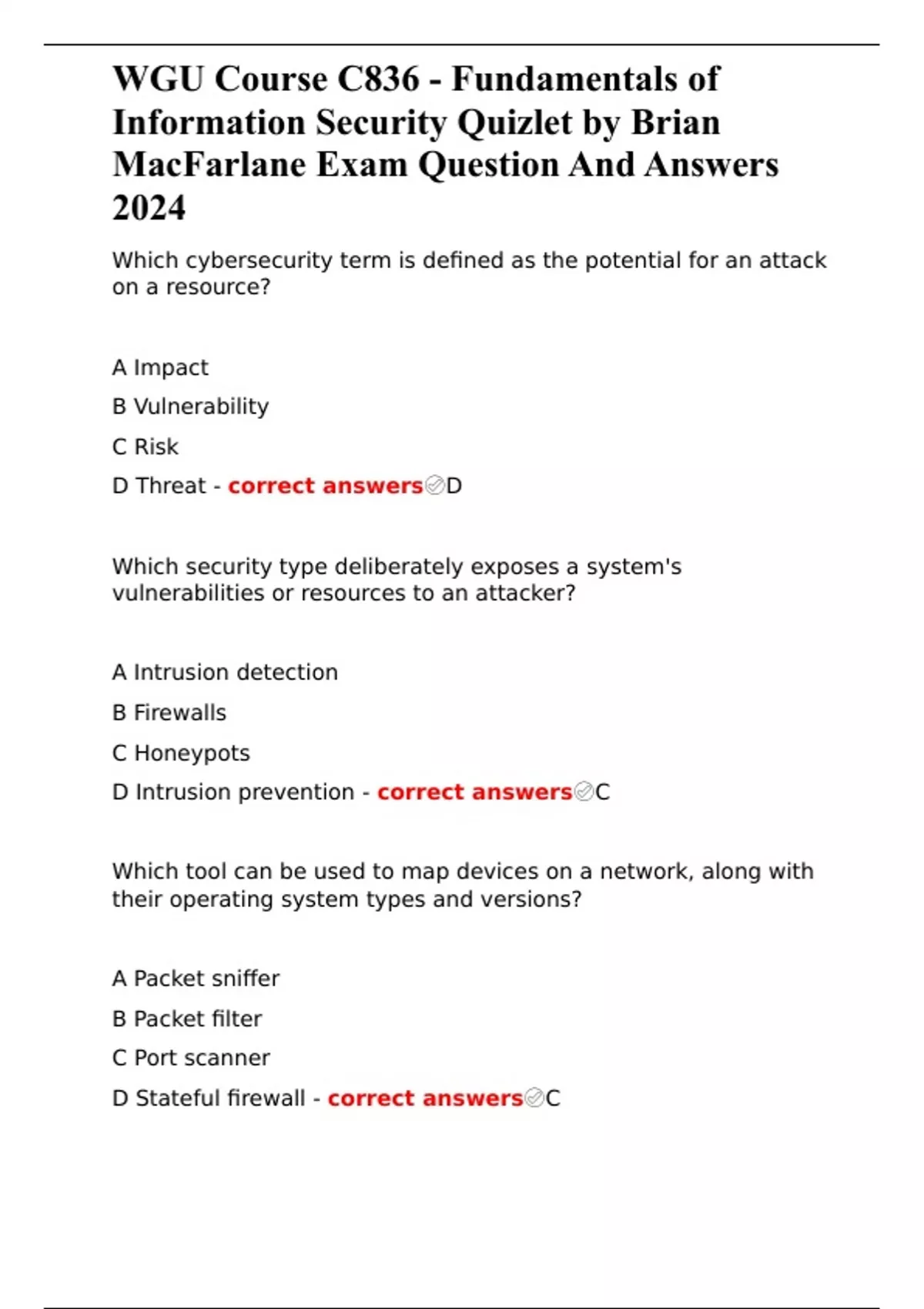 WGU Course C836 - Fundamentals of Information Security Quizlet by Brian MacFarlane Exam Question And Answers 2024