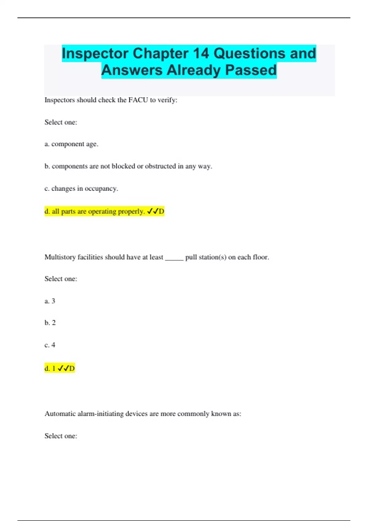 Inspector Chapter 14 Questions and Answers Already Passed Inspectors should check the FACU to verify: Select one: a. component age. b. components are not blocked or obstructed in any way. c. changes in occupancy. d. all parts are operating properly. D Multistory facilities should have at least _____ pull station(s) on each floor. Select one: a. 3 b. 2 c. 4 d. 1 D Automatic alarm-initiating devices are more commonly known as: Select one: a. detectors. b. alarms. c. activators. d. initiators. A During a monthly test for alarm signaling systems using backup electrical generators, how long should a generator run under load? Select one: a. 60 minutes b. 30 minutes c. 20 minutes d. 15 minutes B Which type of flame detector is effective in monitoring large areas such as aircraft hangars and computer rooms? Select one: a. Photoelectric detectors b. Combination detectors c. Ultraviolet detectors d. Infrared detectors D A permanent record of all detector tests must be maintained for at least: Select one: a. 3 years b. 10 years c. 5 years d. 25 years C What do heat detectors require in order to be effective? Select one: a. Professional installation b. Continuous testing c. Proper placement d. 24-hour monitoring C All components of emergency voice/alarm systems should be tested at least: Select one: a. semiannually. b. monthly. c. annually. d. weekly. C