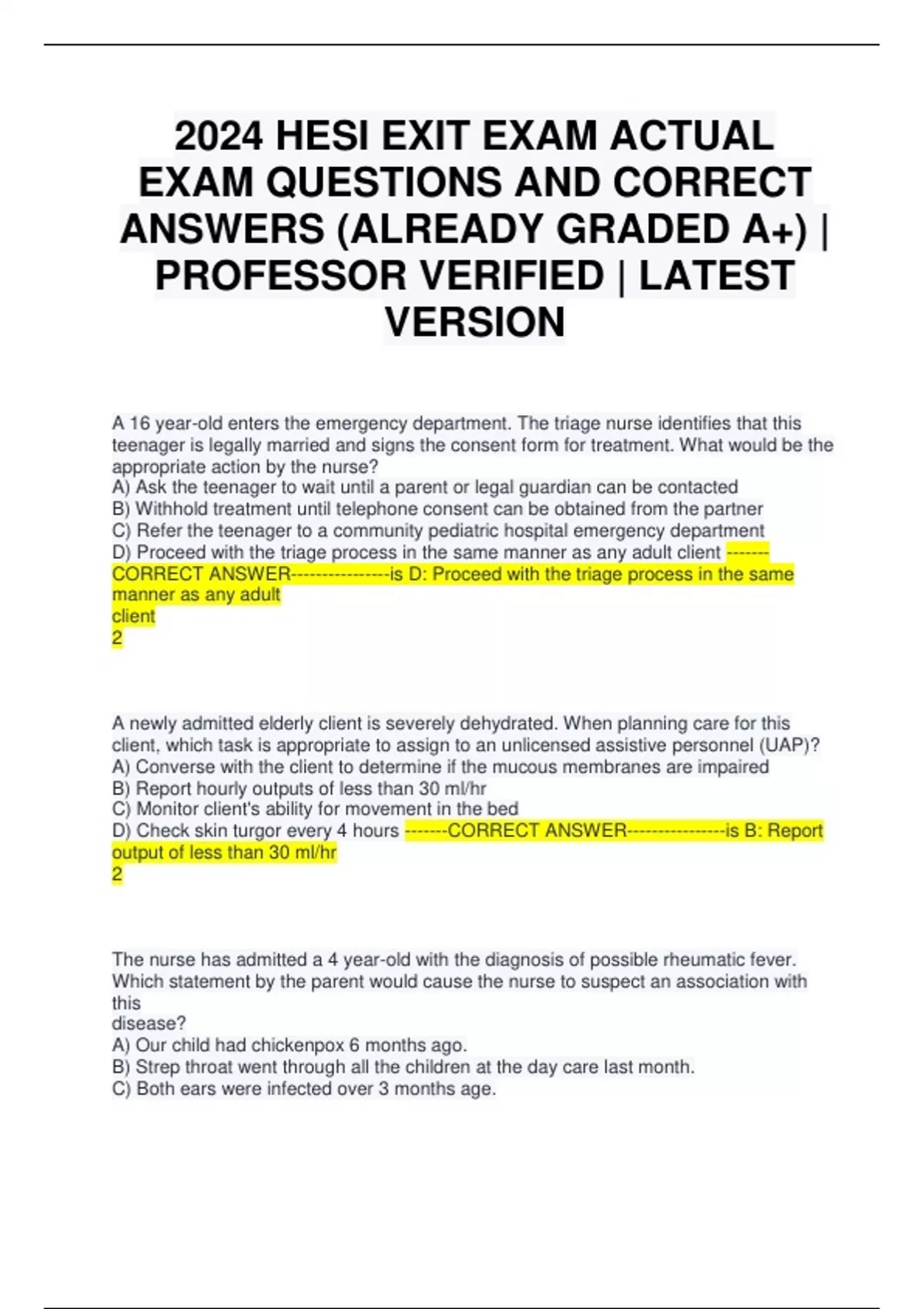 HESI EXIT EXAM 2024 ACTUAL EXAM | ALL QUESTIONS AND CORRECT ANSWERS (GRADED A+) | PROFESSOR VERIFIED | LATEST EXAM