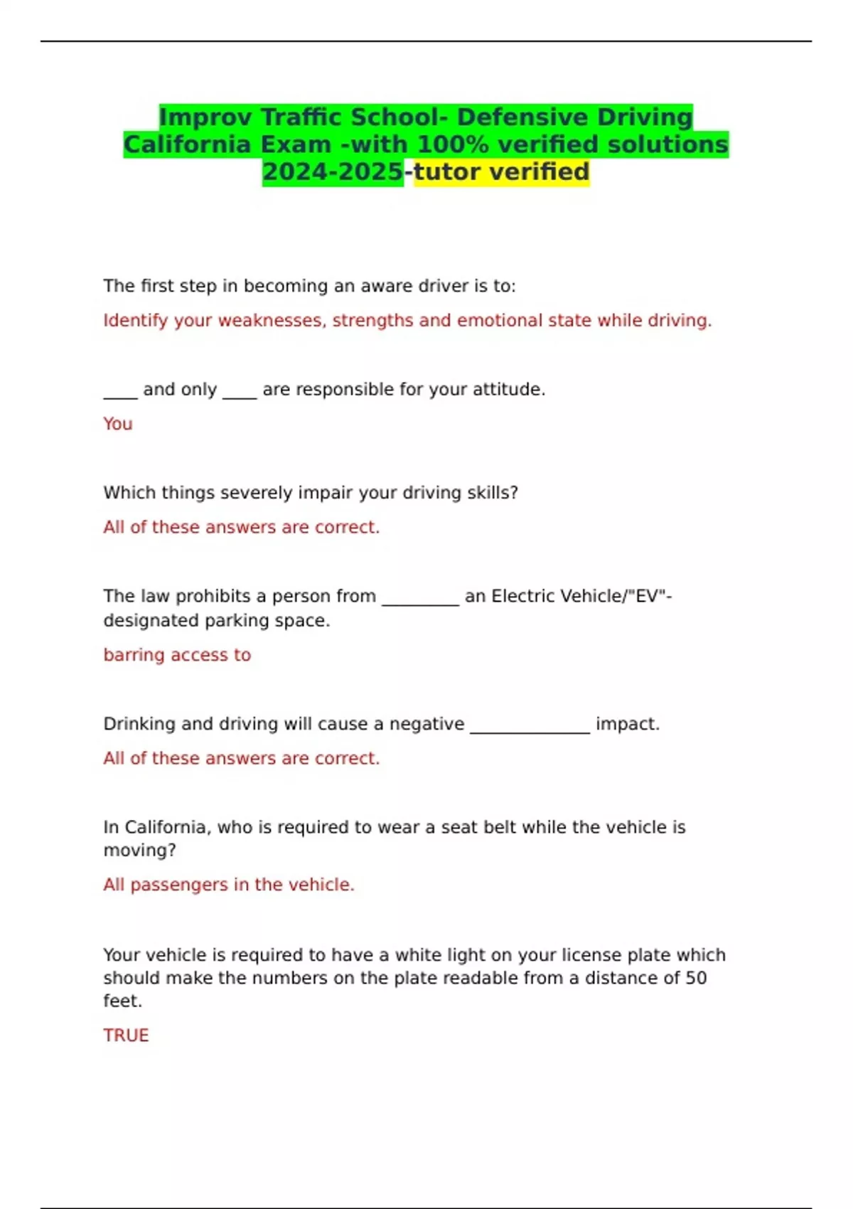 Improv Traffic School- Defensive Driving California Exam -with 100% verified solutions -tutor verified