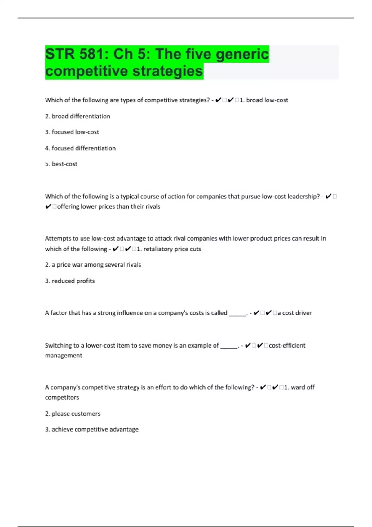 STR 581: Ch 5: The five generic competitive strategies 100 Questions with 100% Correct Answers | Verified | Updated 2024