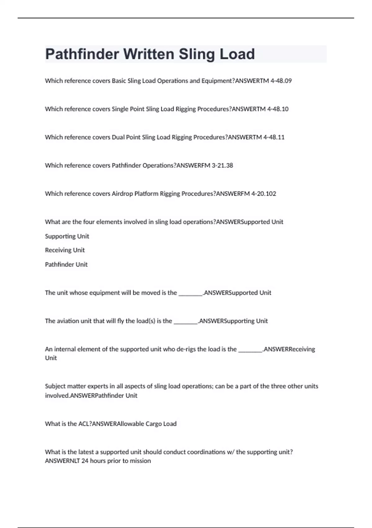 Pathfinder Written Sling Load Exam Study Questions With Well Revised Answers 2024 Verified 100%
