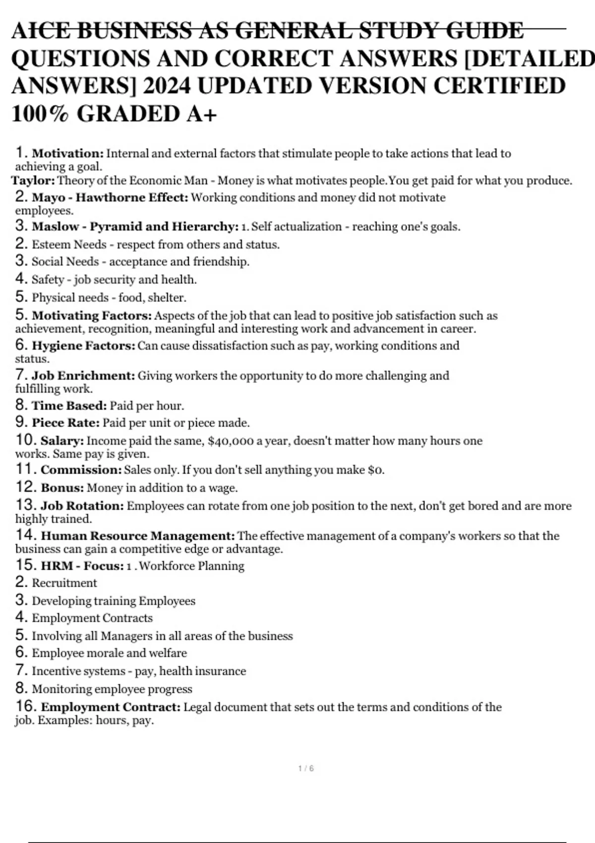 AICE BUSINESS AS GENERAL STUDY GUIDE QUESTIONS AND CORRECT ANSWERS [DETAILED ANSWERS] 2024 UPDATED VERSION CERTIFIED 100% GRADED A+ AICE BUSINESS AS GENERAL STUDY GUIDE QUESTIONS AND CORRECT ANSWERS [DETAILED ANSWERS] 2024 UPDATED VERSION CERTIFIED 100% GRADED A+