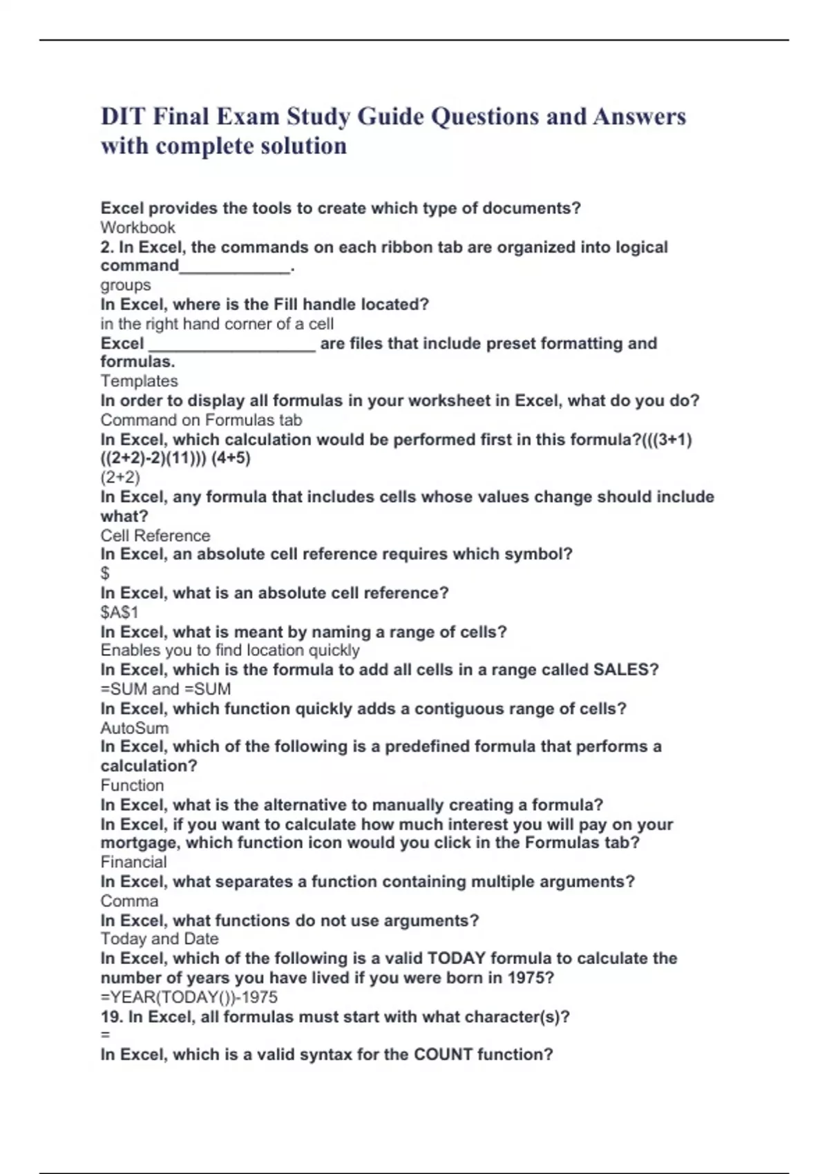 DIT Final Exam Study Guide Questions and Answers with complete solution Excel provides the tools to create which type of documents? Workbook 2. In Excel, the commands on each ribbon tab are organized into logical command____________. groups In Excel, where is the Fill handle located? in the right hand corner of a cell Excel __________________ are files that include preset formatting and formulas. Templates In order to display all formulas in your worksheet in Excel, what do you do? Command on Formulas tab In Excel, which calculation would be performed first in this formula?(((3+1)((2+2)-2)(11))) (4+5) (2+2) In Excel, any formula that includes cells whose values change should include what? Cell Reference In Excel, an absolute cell reference requires which symbol? $ In Excel, what is an absolute cell reference? $A$1 In Excel, what is meant by naming a range of cells? Enables you to find location quickly In Excel, which is the formula to add all cells in a range called SALES? =SUM and =SUM In Excel, which function quickly adds a contiguous range of cells? AutoSum In Excel, which of the following is a predefined formula that performs a calculation? Function In Excel, what is the alternative to manually creating a formula? In Excel, if you want to calculate how much interest you will pay on your mortgage, which function icon would you click in the Formulas tab? Financial In Excel, what separates a function containing multiple arguments? Comma In Excel, what functions do not use arguments? Today and Date In Excel, which of the following is a valid TODAY formula to calculate the number of years you have lived if you were born in 1975? =YEAR(TODAY())-1975 19. In Excel, all formulas must start with what character(s)? = In Excel, which is a valid syntax for the COUNT function?