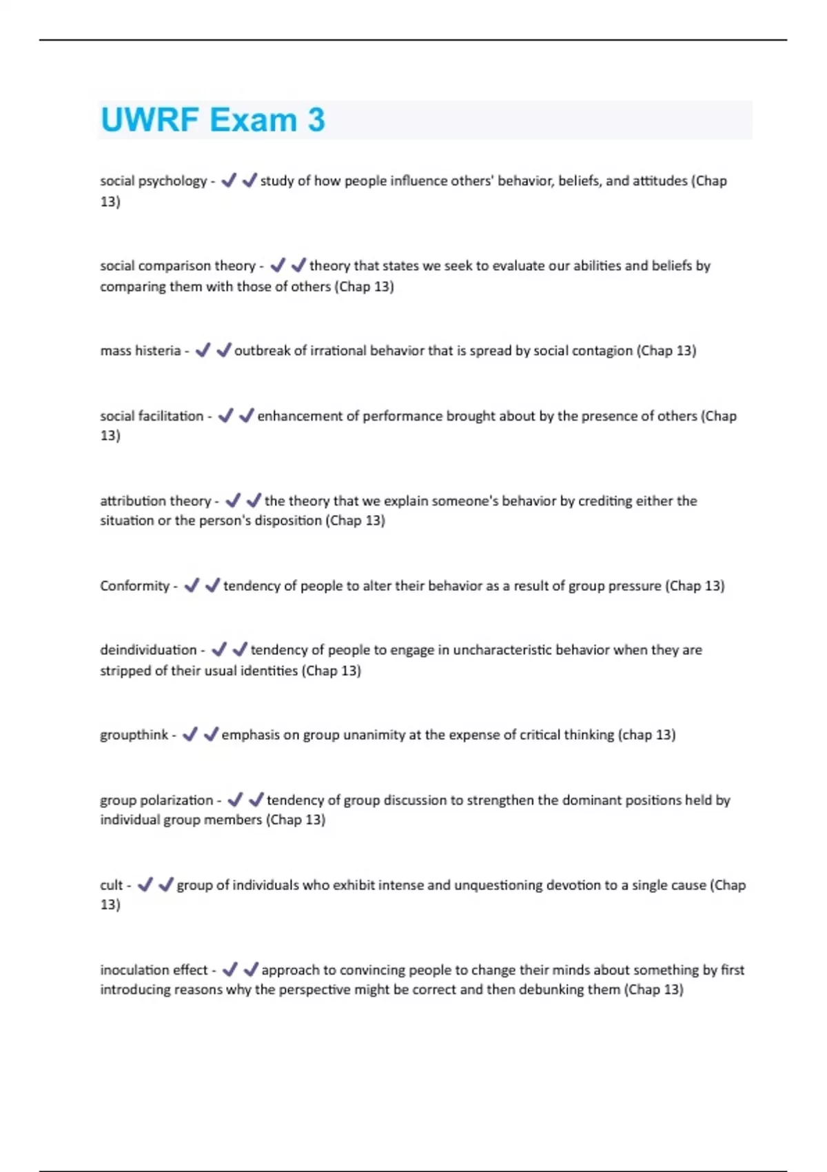 social psychology - study of how people influence others' behavior, beliefs, and attitudes (Chap 13) social comparison theory - theory that states we seek to evaluate our abilities and beliefs by comparing them with those of others (Chap 13) mass histeria - outbreak of irrational behavior that is spread by social contagion (Chap 13) social facilitation - enhancement of performance brought about by the presence of others (Chap 13) attribution theory - the theory that we explain someone's behavior by crediting either the situation or the person's disposition (Chap 13) Conformity - tendency of people to alter their behavior as a result of group pressure (Chap 13) deindividuation - tendency of people to engage in uncharacteristic behavior when they are stripped of their usual identities (Chap 13) groupthink - emphasis on group unanimity at the expense of critical thinking (chap 13) group polarization - tendency of group discussion to strengthen the dominant positions held by individual group members (Chap 13) cult - group of individuals who exhibit intense and unquestioning devotion to a single cause (Chap 13) inoculation effect - approach to convincing people to change their minds about something by first introducing reasons why the perspective might be correct and then debunking them (Chap 13)Stanley Milgram's Obedience Study - Had a "teacher" give shocks to a "learner" if he gave the wrong answer....found that 63 percent would give all shocks even when the learner was screaming in pain (Chap 13) pluralistic ignorance - error of assuming that no one in a group perceives things as we do (Chap 13) diffusion of responsibility - reduction in feelings of personal responsibility in the presence of others (Chap 13) enlightenment effect - learning about psychological research can change real-world behavior for the better (Chap 13) social loafing - phenomenon whereby individuals become less productive in groups (Chap 13) altruism - helping others for unselfish reasons (Chap 13) aggression - behavior intended to harm others, either verbally or physically (Chap 13) relational aggression - form of indirect aggression prevalent in girls, involving spreading rumors, gossiping, and using nonverbal putdowns for the purpose of social manipulation (Chap 13) prejudice - the drawing of negative conclusions about a person, group of people, or situation prior to evaluating the evidence (Chap 13) stereotype - a belief, positive or negative, about the characteristics of members of a group that is applied generally to most members of the group (Chap 13) ultimate attribution error - assumption that behaviors among individual members of a group are due to their internal dispositions (Chap 13)adaptive conservatism - evolutionary principle that creates a predisposition toward distrusting anything or anyone unfamiliar or different (Chap 13) in-group bias - tendency to favor within individuals within our group over those from outside our group (Chap 13) out-group homogeneity - tendency to view all individuals outside our group as highly similar (Chap 13) Discrimination - negative behavior toward members of out-groups. (Chap 13) scapegoat hypothesis - claim that prejudice arises from a need to blame other groups for our misfortunes (Chap 13) just-world hypothesis - claim that our attributions and behaviors are shaped by a deep-seated assumption that the world is fair and all things happen for a reason (Chap 13) explicit prejudice - unfounded negative belief of which we're aware regarding the characteristics of an out-group (Chap 13) implicit prejudice - unfounded negative belief of which we're unaware regarding the characteristics of an out-group (Chap 13) jigsaw classroom - educational approach designed to minimize prejudice by requiring all children to make independent contributions to a shared project (Chap 13) Normal Conformity - desire to fit into a group because of fear of rejection asch experiments shows the strength of social influence on this (Chap 13)Informational Conformity - conformity that occurs when conformity pressures actually persuade group members to adopt new beliefs and/or attitudes (Chap 13) Solomon Asch's Conformity Study - Conformity is yielding to group pressure when no explicit demand has been made. Subjects compared lengths of lines. Asked to chose which line had same length as comparison line. Comparison were easy and obvious. Strong tendency for subjects to conform to incorrect responses of confederates. (Chap 13) cognitive dissonance theory - the theory that we act to reduce the discomfort we feel when two of our thoughts are inconsistent (Chap 13) Reciprocity norm - an expectation that people will help, not hurt, those who have helped them (Chap 13) Foot-in-the door - the tendency for people who have first agreed to a small request to comply later with a larger request (Chap